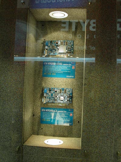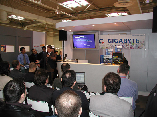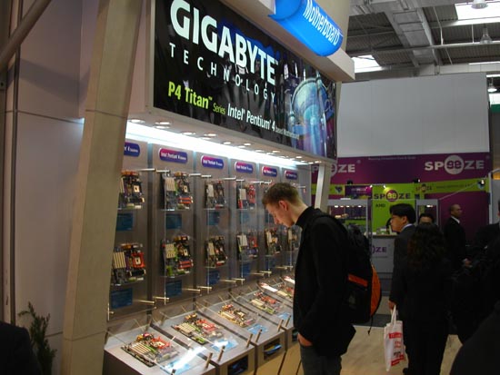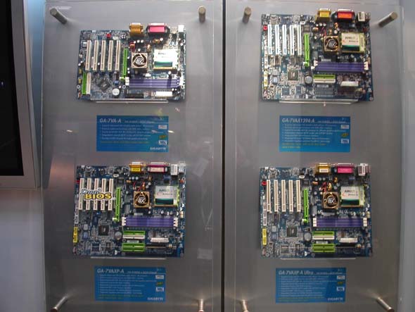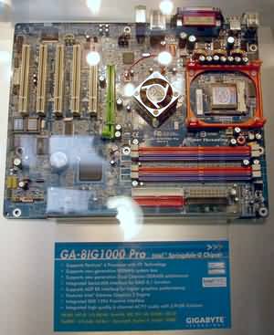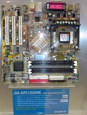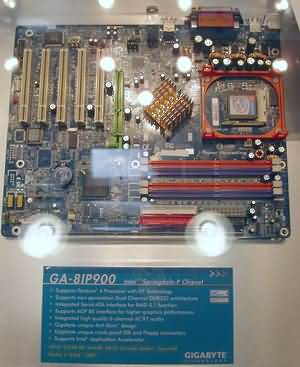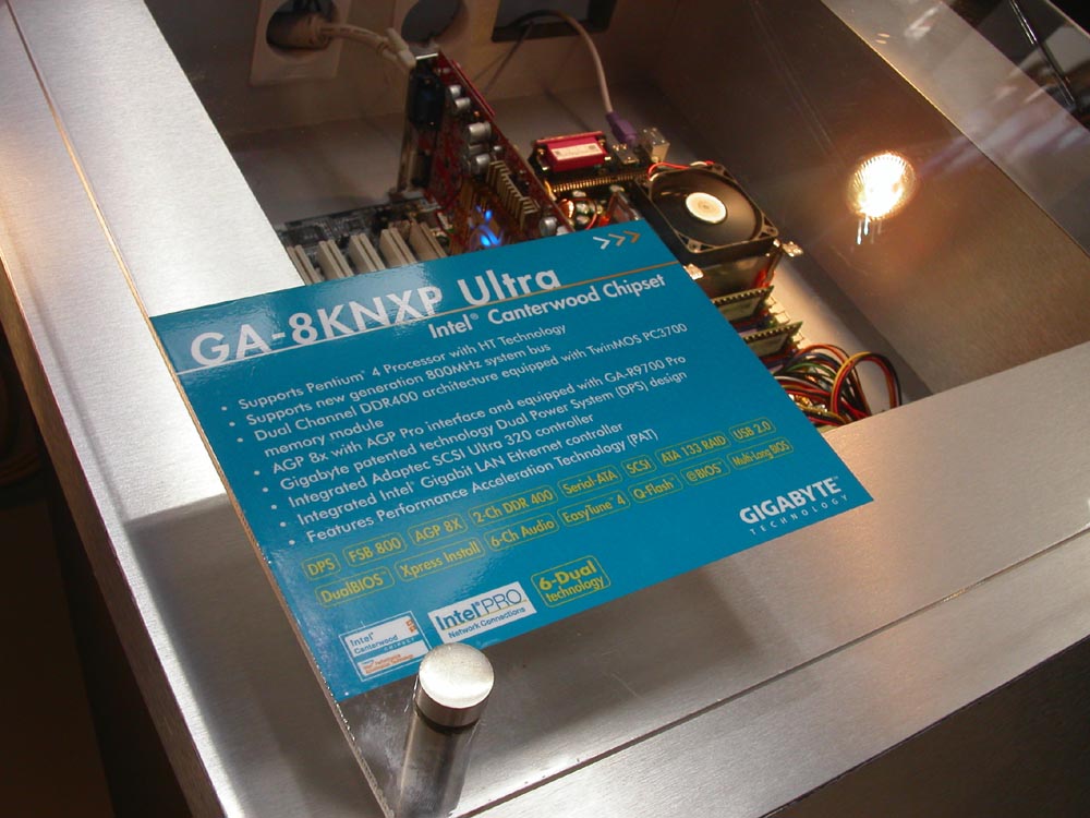 Теперь — несколько слов о новых системных платах компании. Разумеется, представлено великое множество вариантов на новых чипсетах от Intel — Canterwood и Springdale. Например, GA-8KNXP Ultra на чипсете Canterwood: