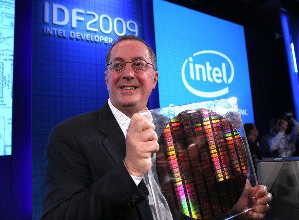 Исполнительный директор Intel Пол Отеллини держит новую (на 2009 г.) пластину с процессорами, из которой получится 20–30 разных моделей.