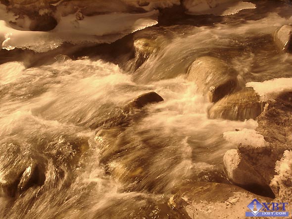 Собственно, основные сложности подобной съемки связаны с комплексом факторов, крайне неприятных как для техники, так и для оператора. Во-первых, это большой диапазон яркостей. Горный воздух фактически не рассеивает свет, и если в тени совсем темно, то освещенность на ярком снегу такова, что ни выдержки в 1/1000 с, ни диафрагмы F:8 не хватает, чтобы проработать фактуру снежного покрова. Поскольку цифровые камеры оснащены обычно очень короткофокусными объективами, то диафрагма 8 — это уже дырка порядка 1 мм, что близко к тому, чтобы изображение начало портиться от дифракции на диафрагме. Поэтому для проработки деталей надо ослаблять световой поток с помощью фильтров. Можно использовать нейтральные светофильтры, а можно воспользоваться и поляризационным. При этом следует помнить, что небо на таком чистом воздухе очень сильно поляризовано, и зачастую, если мы, вращая поляроид, полностью погасим небо, то на цветном снимке белые горы на фоне черного неба смотрятся несколько непривычно. И нередко осветление неба, особенно когда вершины не полностью покрыты снегом и видны скальные выходы, дает лучший результат, Яркое солнце мешает не только фотоаппарату, но и оператору. Без дополнительных приспособлений на ЖК экране увидеть что-нибудь практически невозможно. Даже шахта глубиной 10 см не спасает положения. Отраженный от снега свет полностью ослепляет экран. Единственный способ — это полностью исключить попадание постороннего света на ЖК видоискатель, установив перед ним длинную трубу с лупой и плотно прижав ее открытый конец к глазу. О том, как сделать подобные приспособления, читайте в специальной статье. Здесь же только отмечу, что вся приведенная в статье съемка проводилась с помощью ЖК экрана. Оптическим видоискателем фактически не пользовался, поскольку при таких сумасшедших контрастах автоматика безбожно врет, единственный выход — увидеть изображение на экране.