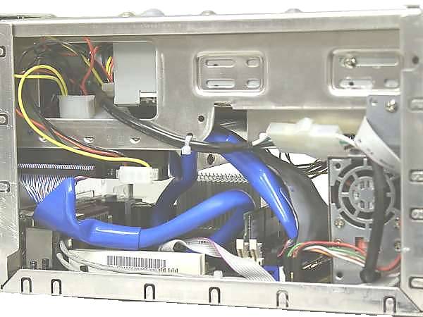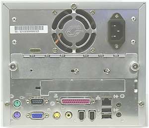 Слева направо располагаются разъемы PS/2-портов клавиатуры и мыши, последовательного порта и VGA (вы не забыли, что видео у нас интегрированное?), выходы S-Video и Composite Video (для TV-Out), разъем параллельного порта, два Firewire (о, об этом отдельный разговор позже), сетевая розетка и еще одна пара USB с Line In/Line Out. Теперь надо еще поднять глаза повыше, чтобы заметить прикрытый заглушкой выход под одну карту расширения. Все, снаружи больше осматривать нечего — открываем.