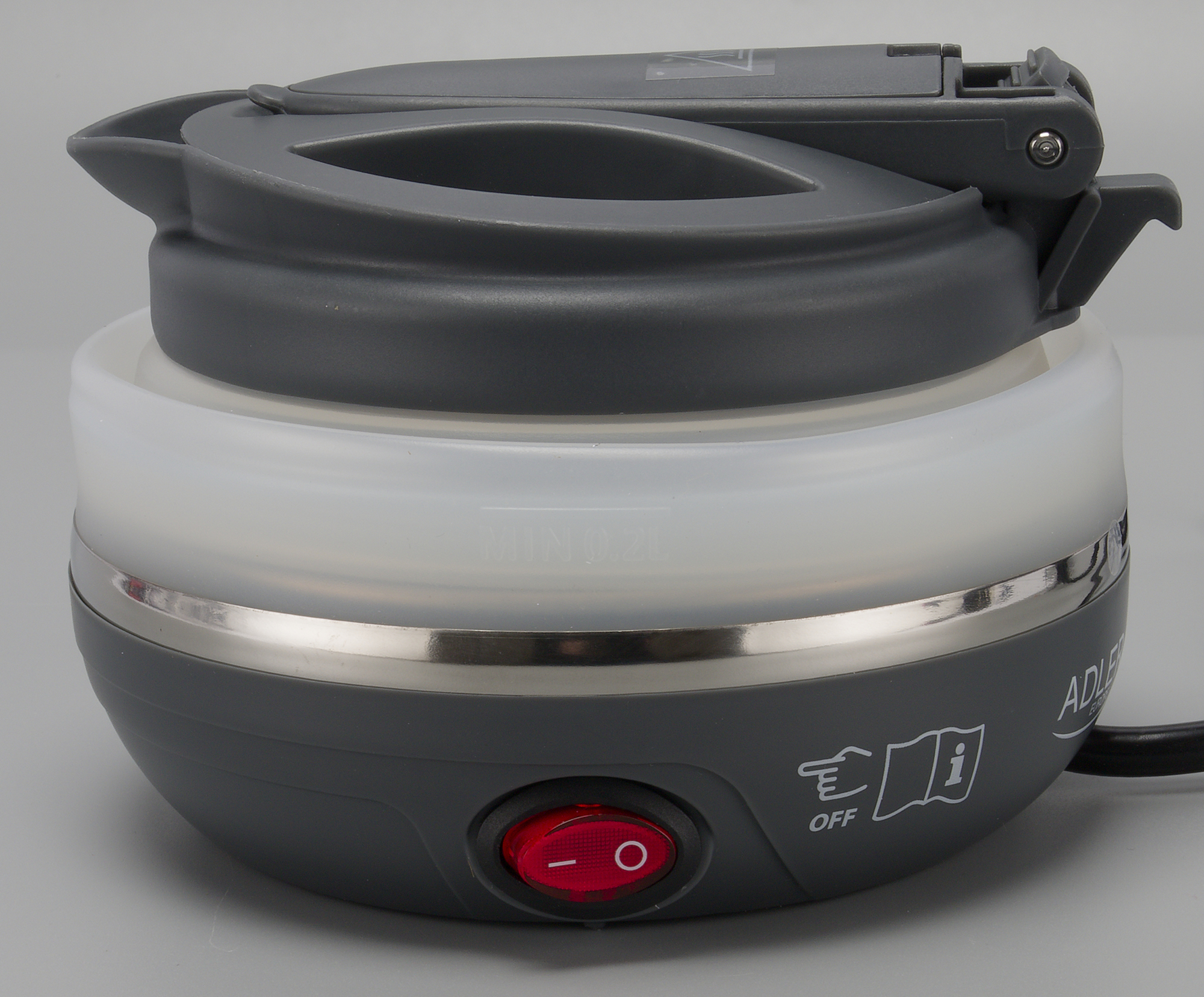 Что ж, давайте рассмотрим предмет тестирования. Начнем сразу с самого интересного: с корпуса. Он у Adler AD1279 силиконовый, благодаря чему складной. Выглядит как классическая гофра, с сужением в верхней части.