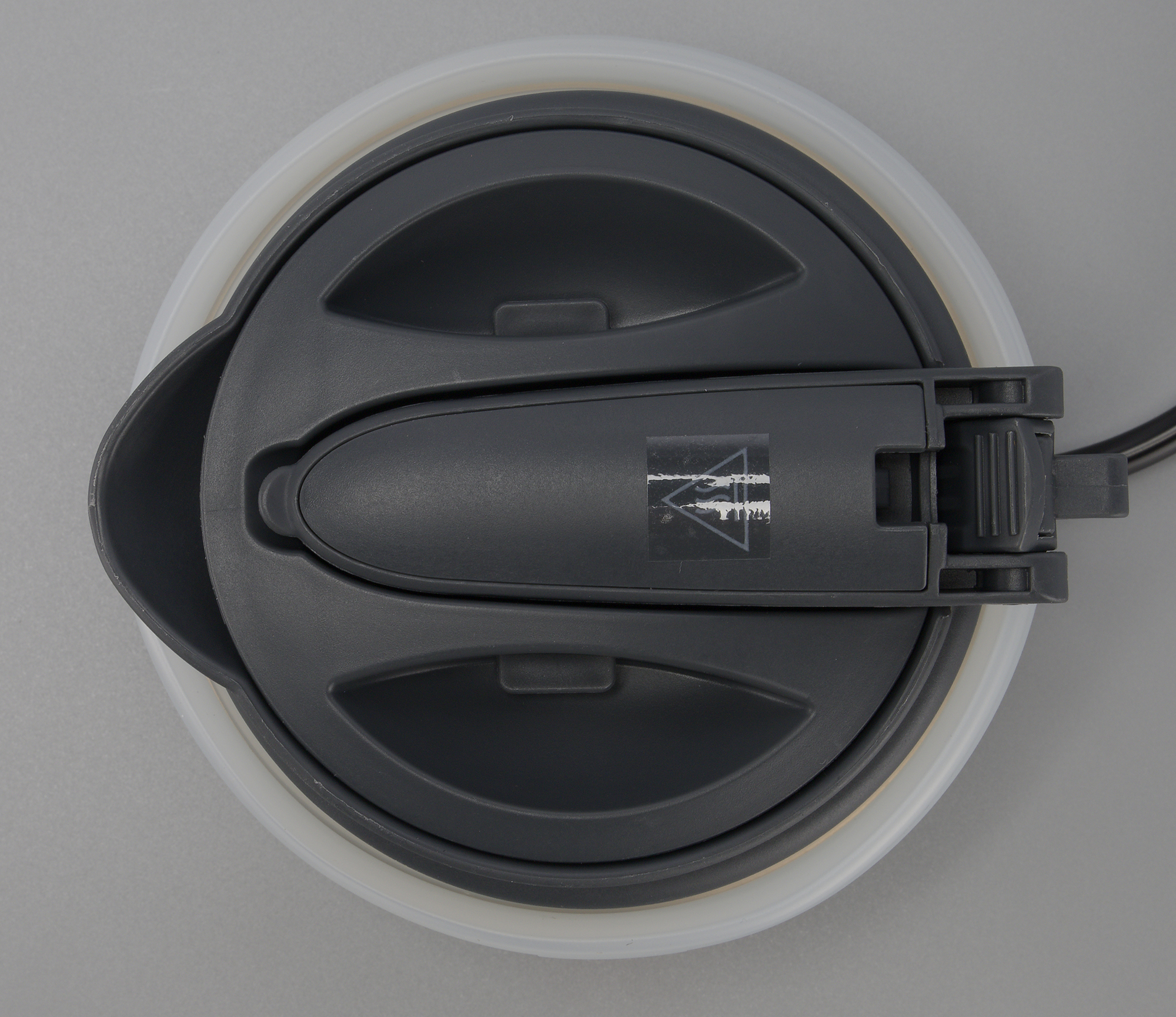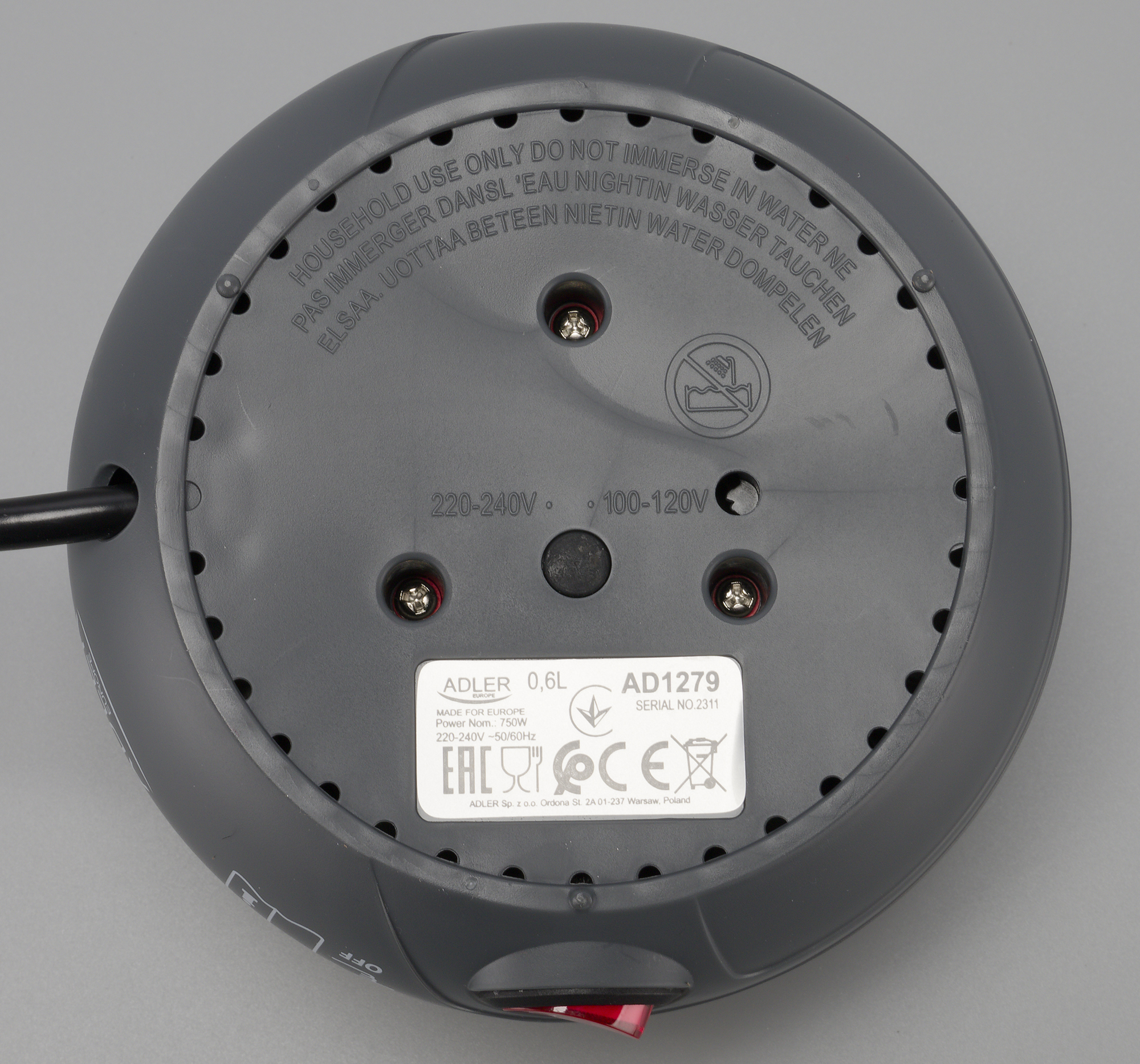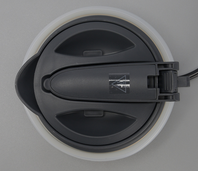 Снизу мы видим наклейку с технической информацией и предупреждение о том, что чайник нельзя погружать в воду. По периметру размещены вентиляционные отверстия. Противоскользящих ножек нет, зато есть три небольших пластиковых выступа, которые выполняют роль миниатюрных ножек.
