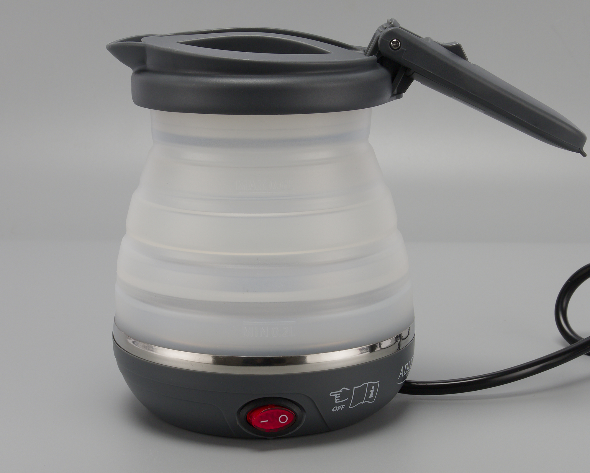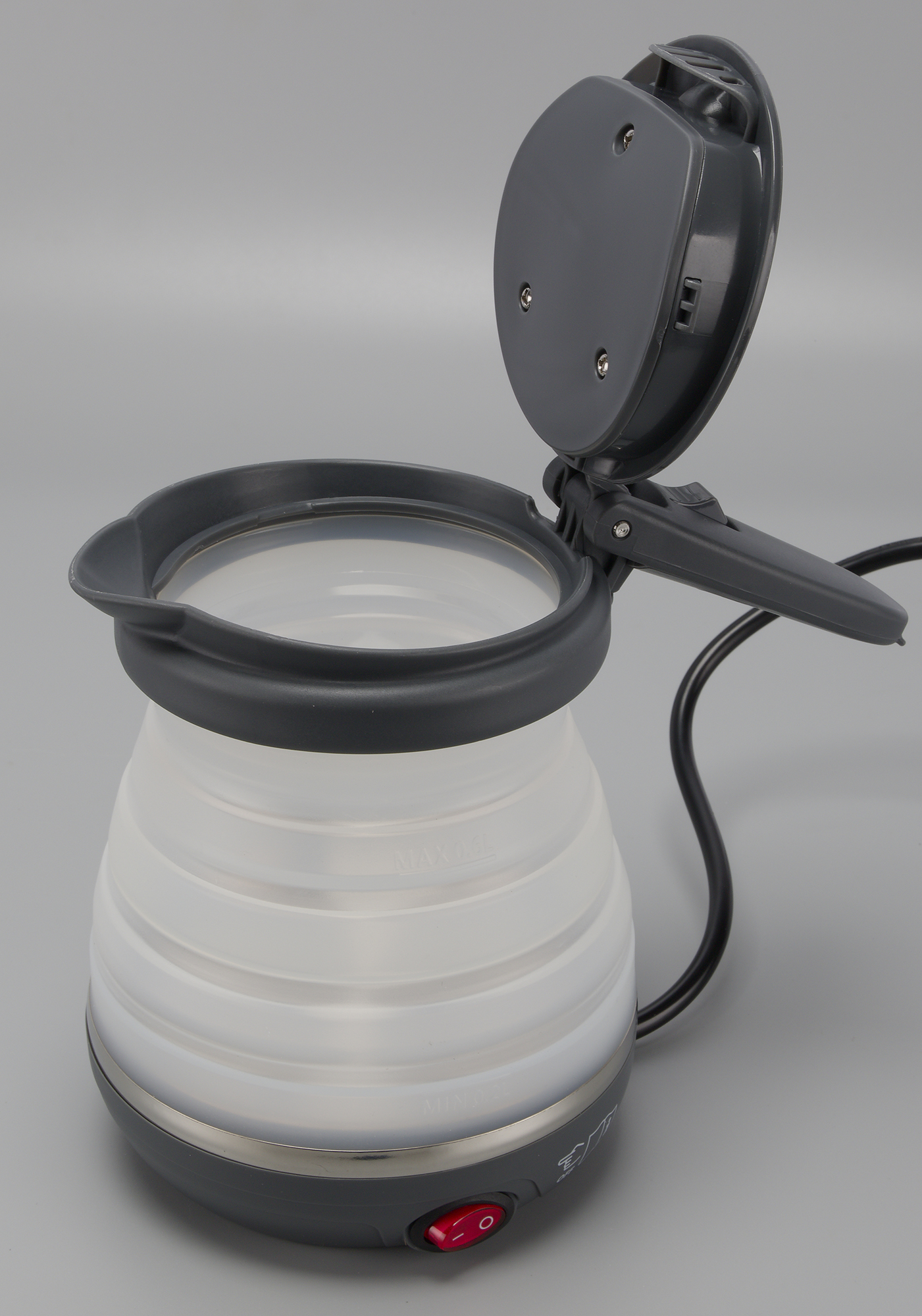 Складывается и раскладывается чайник с небольшим усилием, сделать это совсем несложно. На корпусе можно найти не слишком заметные отметки минимального и максимального уровня воды — 0,2 и 0,6 л соответственно.