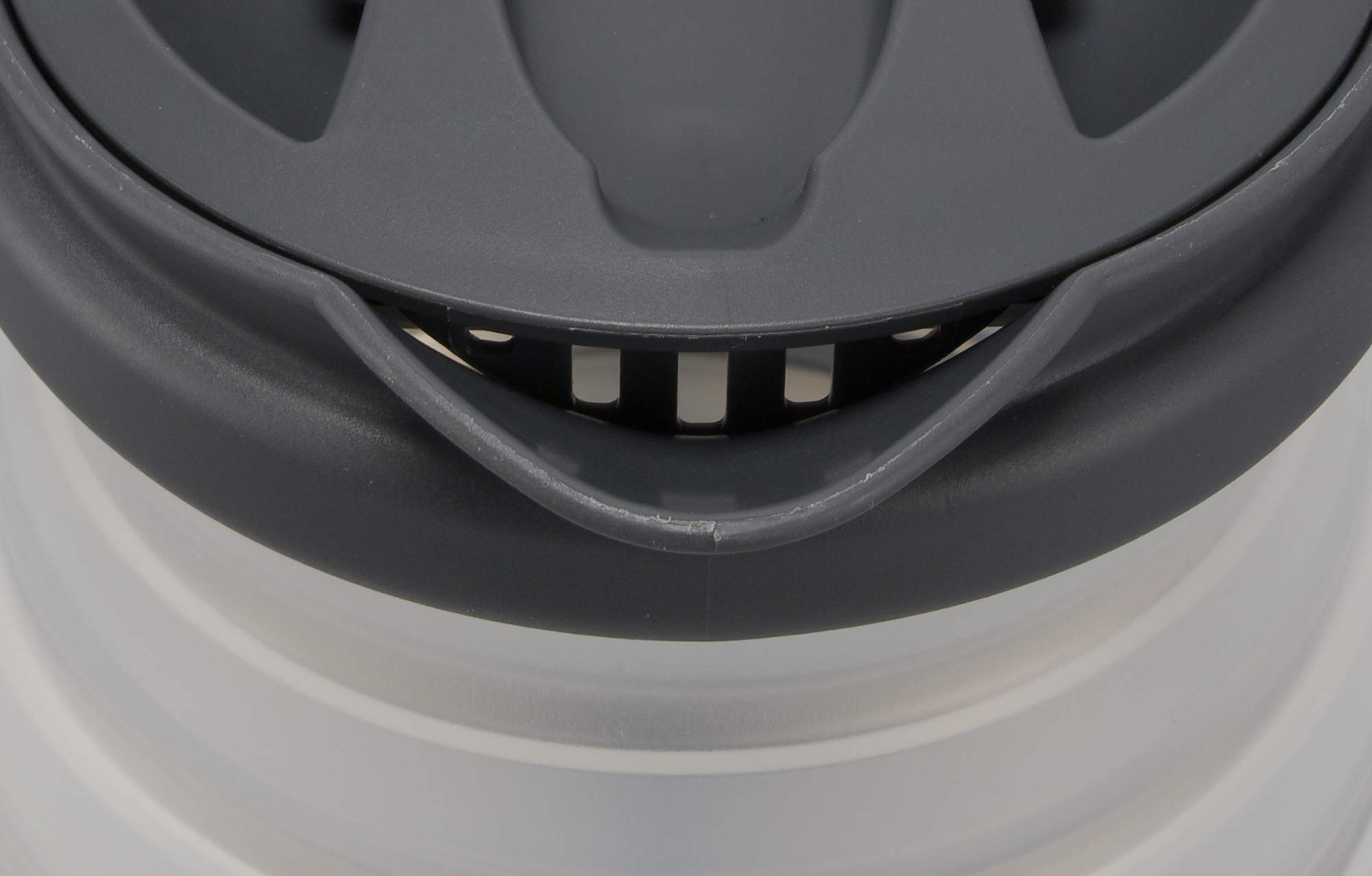 Основной материал чайника — матовый серый пластик. Отпечатки пальцев он практически не собирает, выглядит вполне достойно. В ходе эксплуатации мы обратили внимание, что случайно запачкать прибор, взяв его не слишком чистыми руками, практически невозможно. В нижней части корпуса находится декоративная пластиковая накладка, окрашенная под металл.