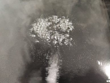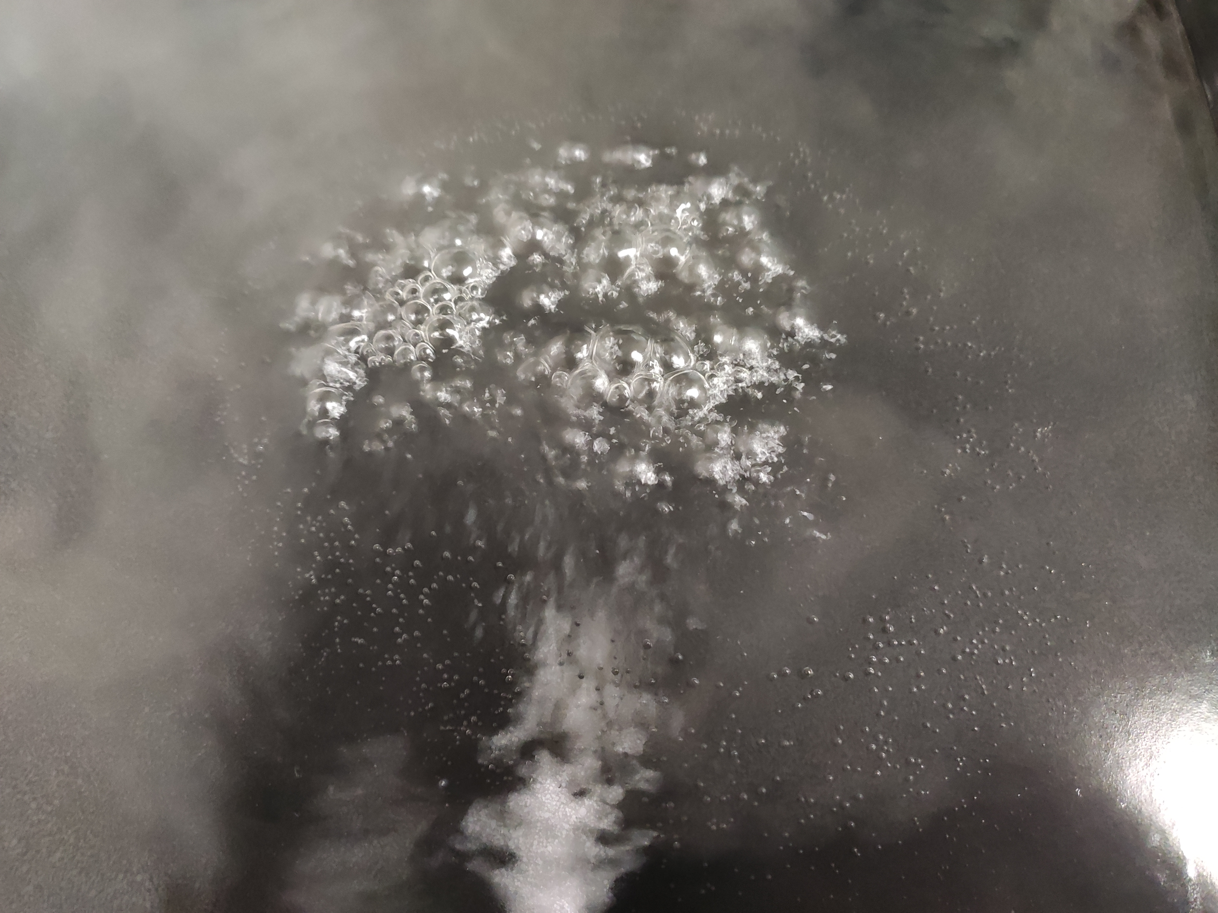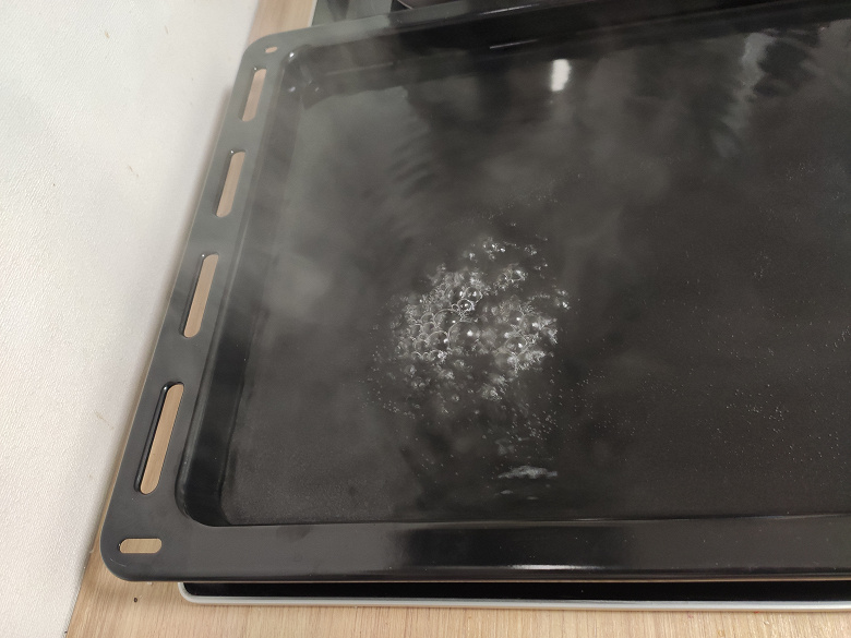 В том, что поверхность отлично справится с томлением и тушением, у нас сомнений нет — нужно лишь угадать с одним из «средних» режимов, после чего процесс не будет нуждаться в контроле со стороны повара. Поэтому попробуем что-нибудь пожарить и сварить. А перед этим посмотрим на равномерность нагрева над тэнами. Для этого воспользуемся противнем с водой.