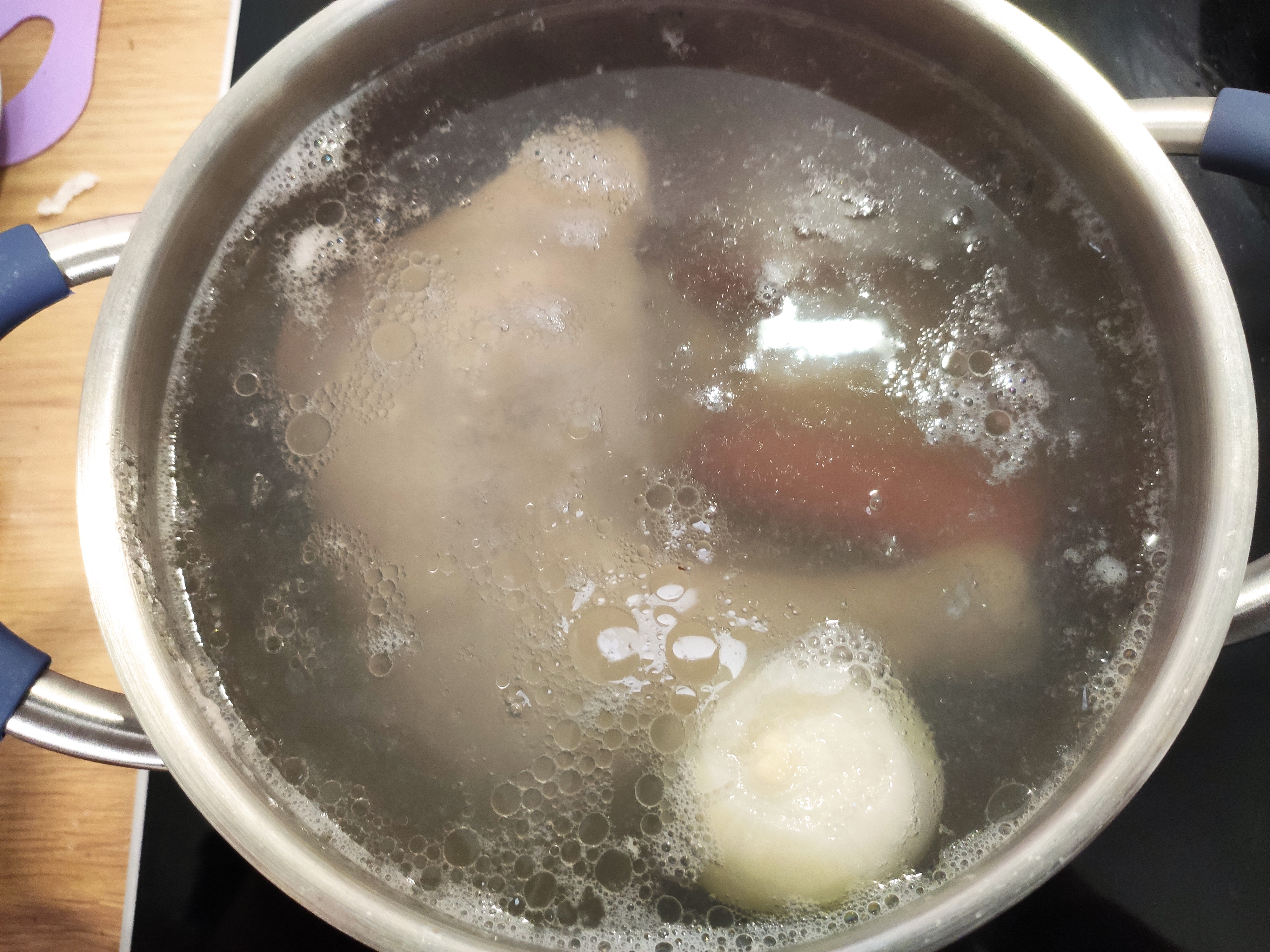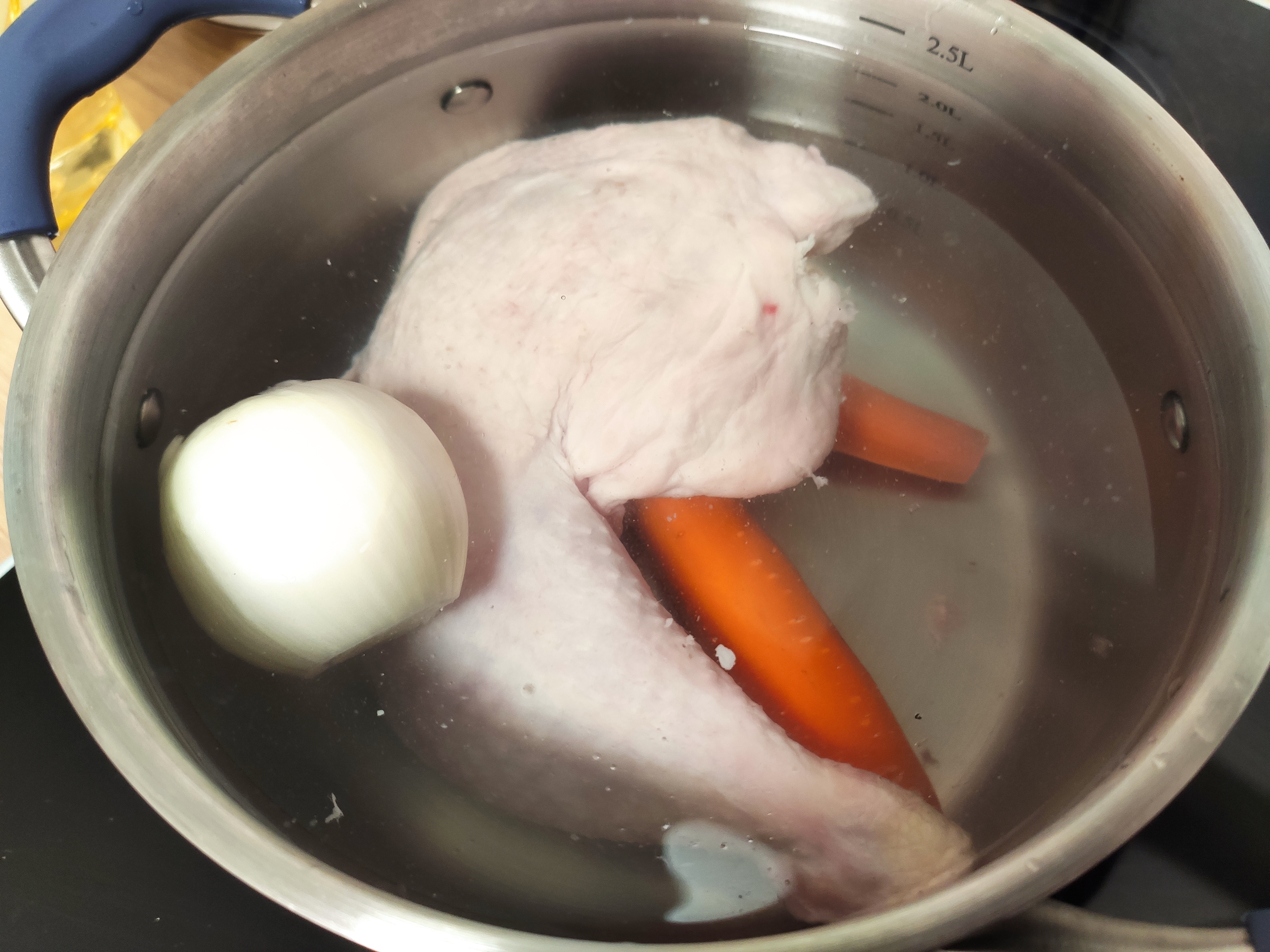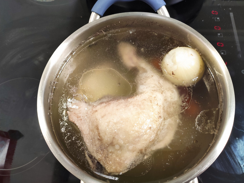 Набор для бульона у нас был самый стандартный: курица, морковь, лук. Залили всё холодной водой, накрыли крышкой и поставили закипать на конфорку с двойным контуром.