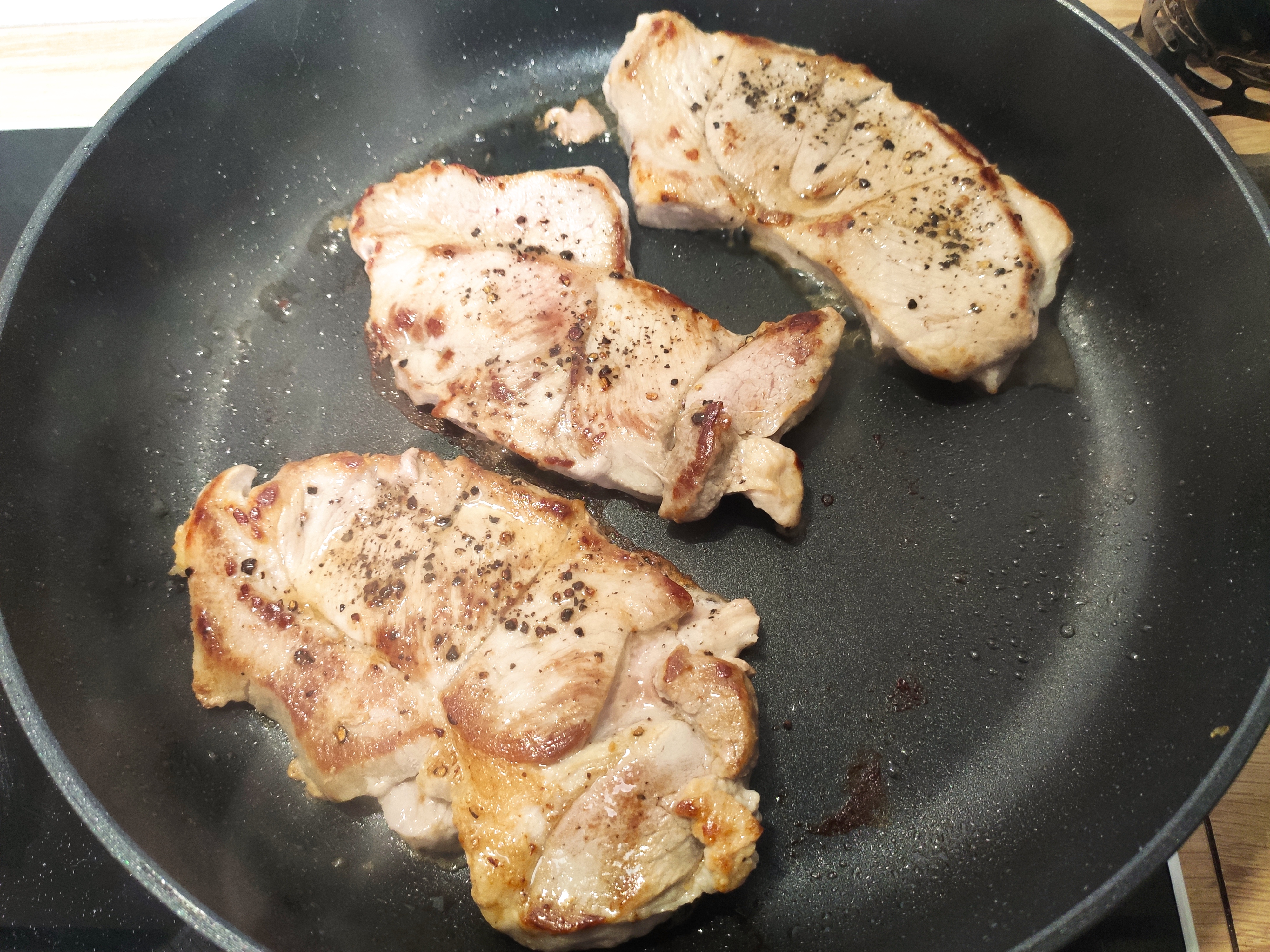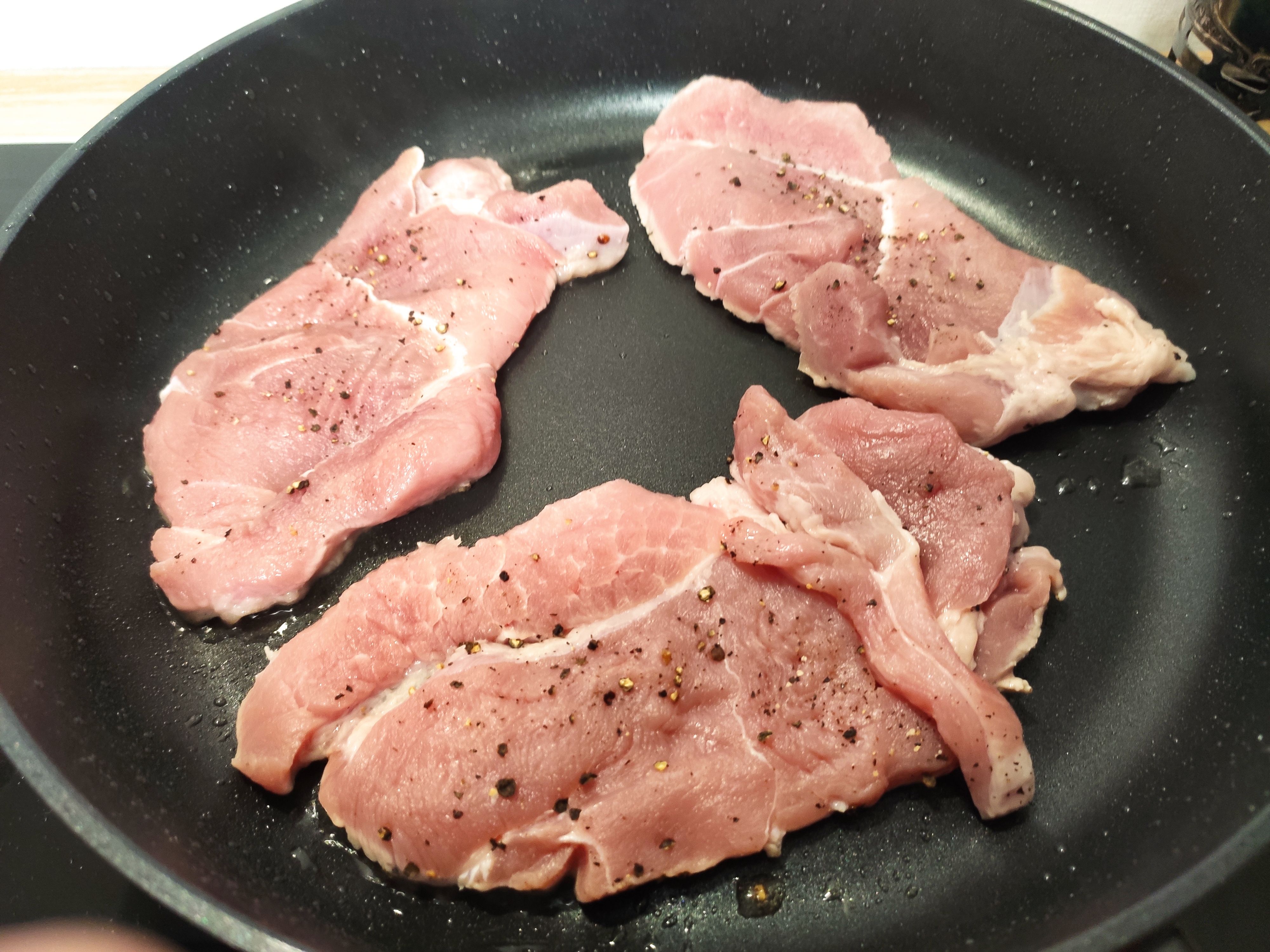 Для этого теста мы вооружились свининой и разместили сковороду на самой мощной одинарной конфорке. Из специй взяли смесь перцев и немного соли.