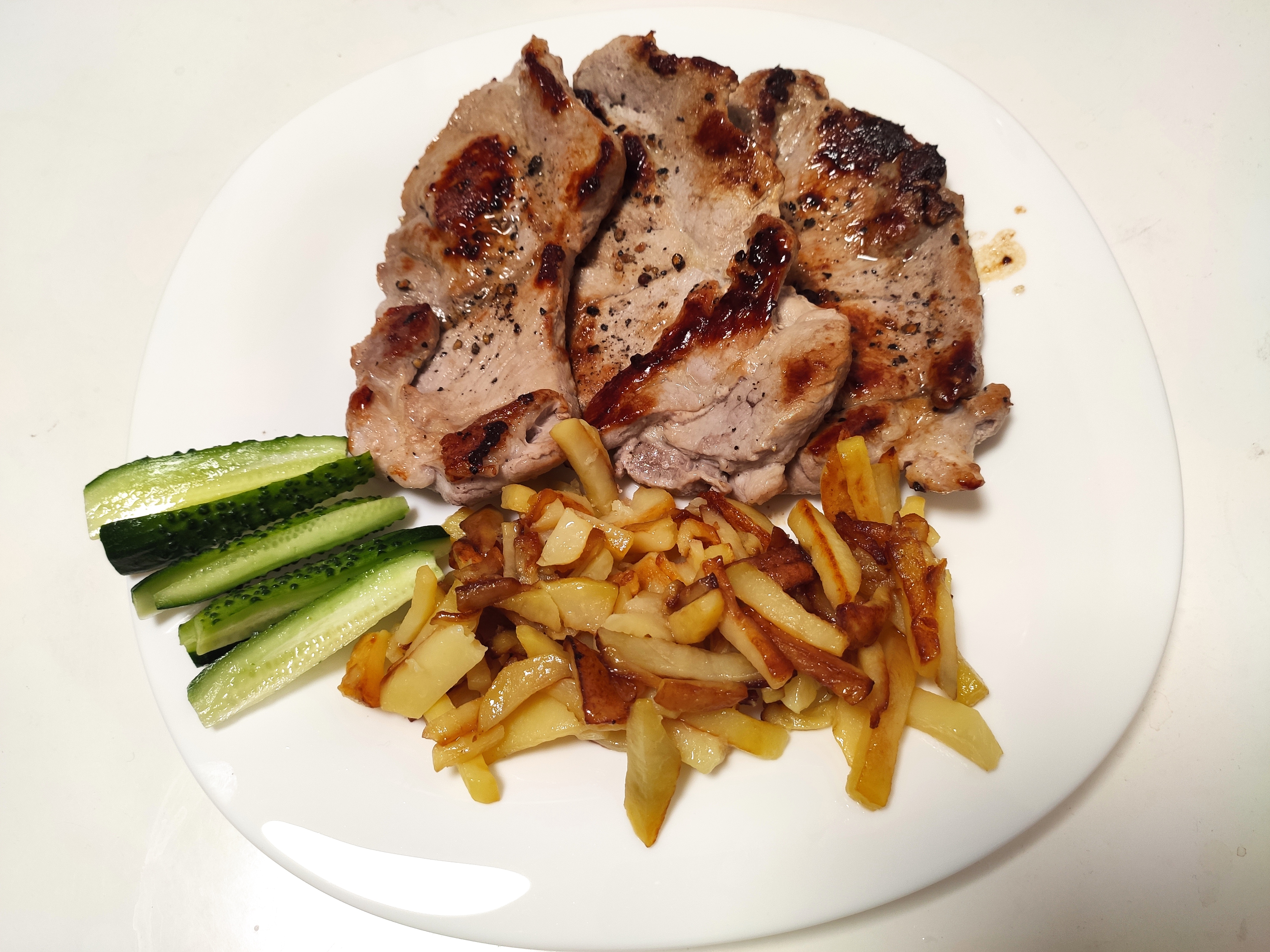 Похоже, наша картошка готова. Вот как она выглядит вместе со свининой из нашего первого теста.