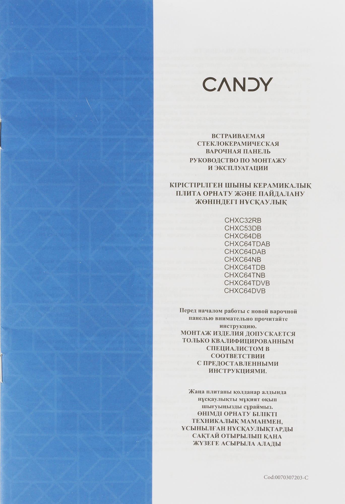 Candy Candy CHXC64TDAB опала к нам помещенной в два пенопластовых ложемента. Вся упаковка была дополнительно обтянута прочным полиэтиленом с массой транспортировочных значков и предупреждений об аккуратном обращении с упаковкой. Сверху и на одной из боковых граней размещены наклейки со штрих-кодами, номером модели и технической информацией. Кроме самой варочной панели, в упаковке мы обнаружили установочный комплект (крепежные скобы с саморезами), руководство пользователя и гарантийный талон.