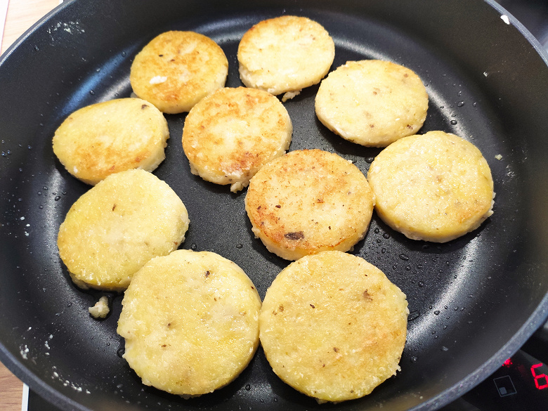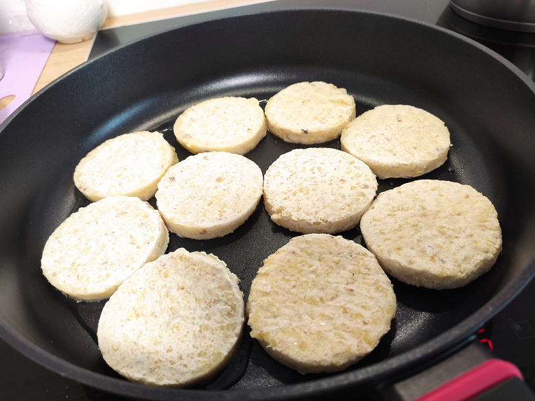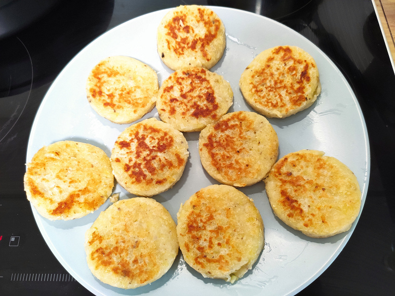 В нашем распоряжении оказались замороженные картофельные драники. Их мы решили использовать для контроля за равномерностью прожарки на разных участках сковороды.