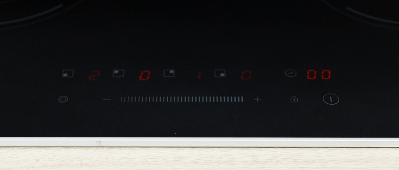 В верхнем ряду мы видим четыре сенсора, отвечающих за выбор конфорки. Рядом с каждым сенсором — красная цифра, отображающая выбранный уровень нагрева (мощность).