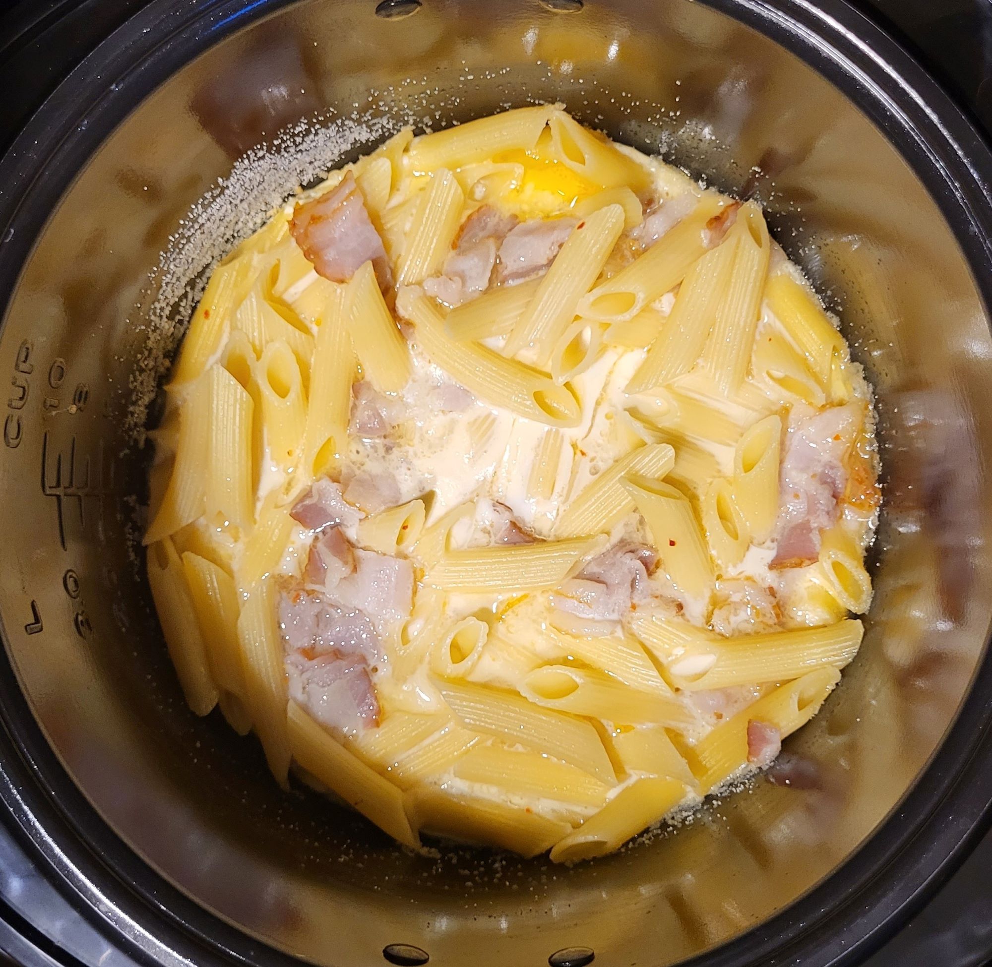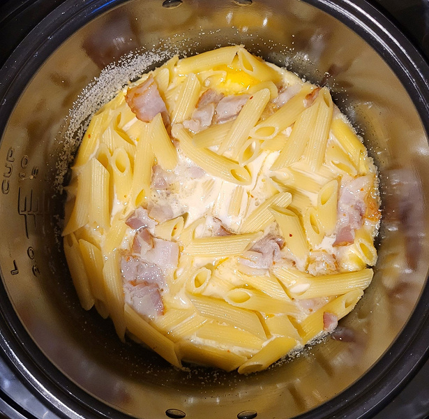 В нашем случае — из макарон с беконом, из фирменной книги рецептов к мультикухне Redmond SkyKitchen RMK-CB391S. Нам понадобились по 150 г макарон и бекона холодного копчения, 200 мл молока, 3 яйца, манка для посыпки формы (в рецепте панировочные сухари, но мы заменили), сливочное масло и соль. В литре воды отварили макароны в соответствующей программе, слили воду, переложили их в отдельную миску, залили приготовленной смесью молока с яйцами. Смазали чашу сливочным маслом, обсыпали манной крупой, положили все в чашу и закрыли крышку и запекали в программе «Выпечка» 35 минут, как рекомендовано в рецепте. Открыв крышку, увидели, что молочно-яичная смесь была сыровата. Потребовалось еще 20 минут до полной готовности, и это не первый случай, когда производитель плохо проверяет рецепты, а выяснять время приготовления надо опытным путем. Скорее всего, в духовке для такой запеканки хватило бы получаса, но не в мультиварке.