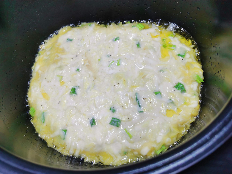 Для приготовления этого блюда мы взяли 4 средние картофелины, 1 пучок зеленого лука, 250 г муки, яйцо, 30 г сливочного масла, 100 мл молока, 200 г сыра Маасдам, 1 столовую ложку растительного масла, соль и молотый черный перец. Картошку и сыр натерли на крупной терке, лук порезали, все смешали, смазали чашу растительным маслом и выложили туда полученное тесто. Рецепт мы взяли из книги, которая идет в комплекте с мультиваркой, но за указанные 20 минут на 160 градусах в режиме Garlyn Шеф мы не получили необходимого результата и добавили еще 20 минут, и все получилось. Пожурили производителя за невнимательность в составлении рецепта, но запеканкой остались довольны.