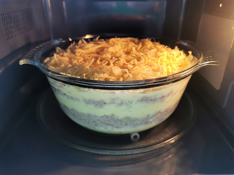 Это блюдо отлично получается в самых обычных микроволновках — даже без конвекции и гриля. Мы готовили такую запеканку в довольно простой модели Hyundai HYM-D2073, с откидной дверцей и в лаконичной микроволновой печи Redmond RM-2303D. Обе СВЧ имеют мощность 800 Вт.