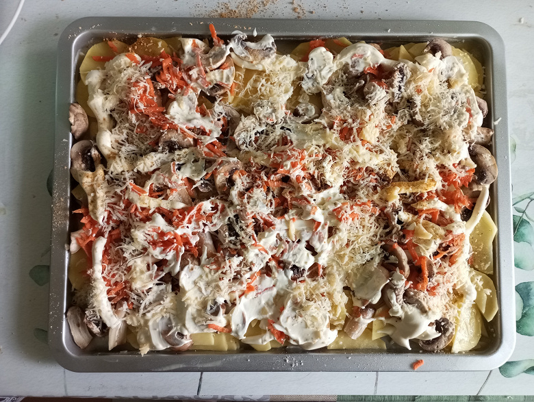 Тестируя мини-печь Hisense HOM45D, мы готовили как раз такие варианты. В первом случае картофель нарезали тонкими ломтиками, посолили, сверху добавили нашинкованные грибы, присыпали тертой морковью, добавили немного сметаны и тертого сыра. Выпекали 15-20 минут при температуре 210 °C в режиме нагрева сверху и снизу с конвекцией.