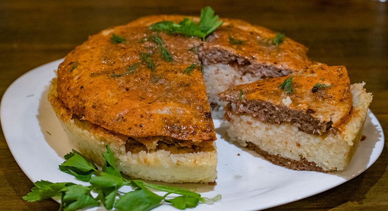 Сначала мы запекали картофель в тканевом пакете, потом горячим размяли его толкушкой (но можно сделать это блендером со специальной насадкой для приготовления пюре), добавили масла, молока, специи, сыр, пару яиц. В среднем 600 г картофеля запекаются на максимальной мощности 10 минут. Фарш для запеканки тоже разморозили в СВЧ — удобно, пока он размораживается, сделать все процедуры с другими продуктами. Фарш смешали с нарезанным луком и специями, после чего отправили на 8 минут в микроволновку, установив максимальную мощность. Фарш отлично пропекся, а лук стал мягким. Потом собрали запеканку в стеклянной форме: нижний слой — пюре, средний — фарш, верхний — пюре. Верх посыпали тертым сыром.