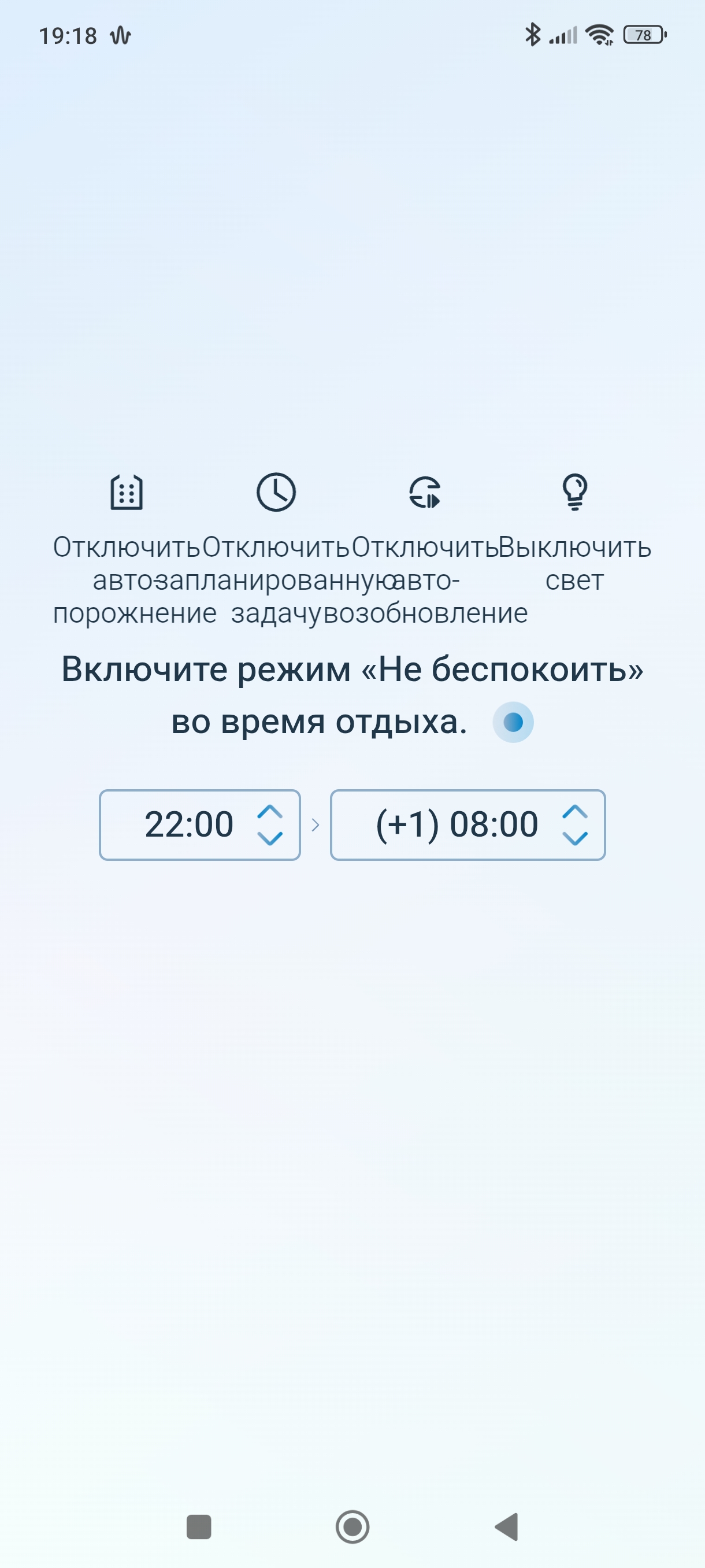 В ходе первого запуска приложение познакомит нас с основными настройками и поможет выбрать оптимальные параметры: настроить часовой пояс и язык приложения, время режима «не беспокоить» и т. п. На этом же этапе будет предложено обновить прошивку.
