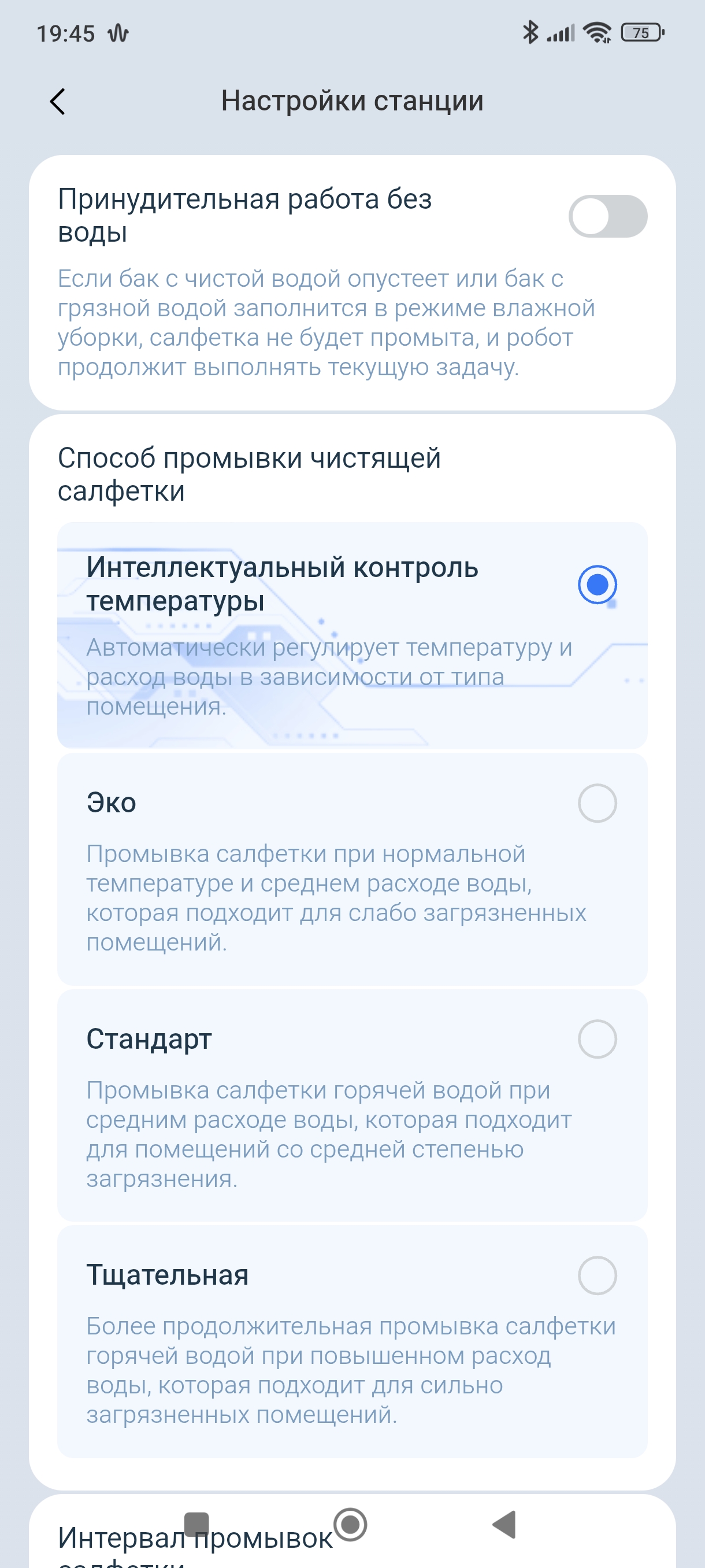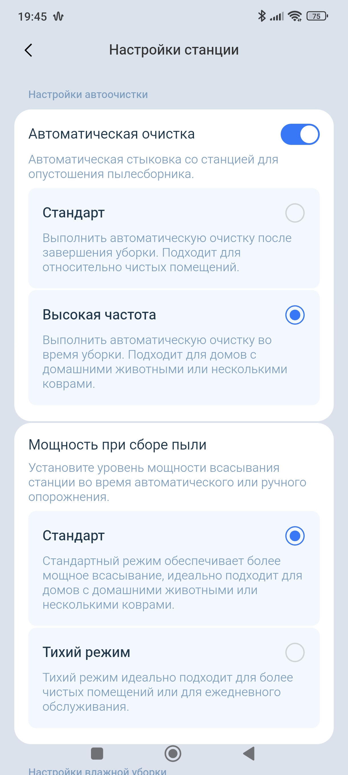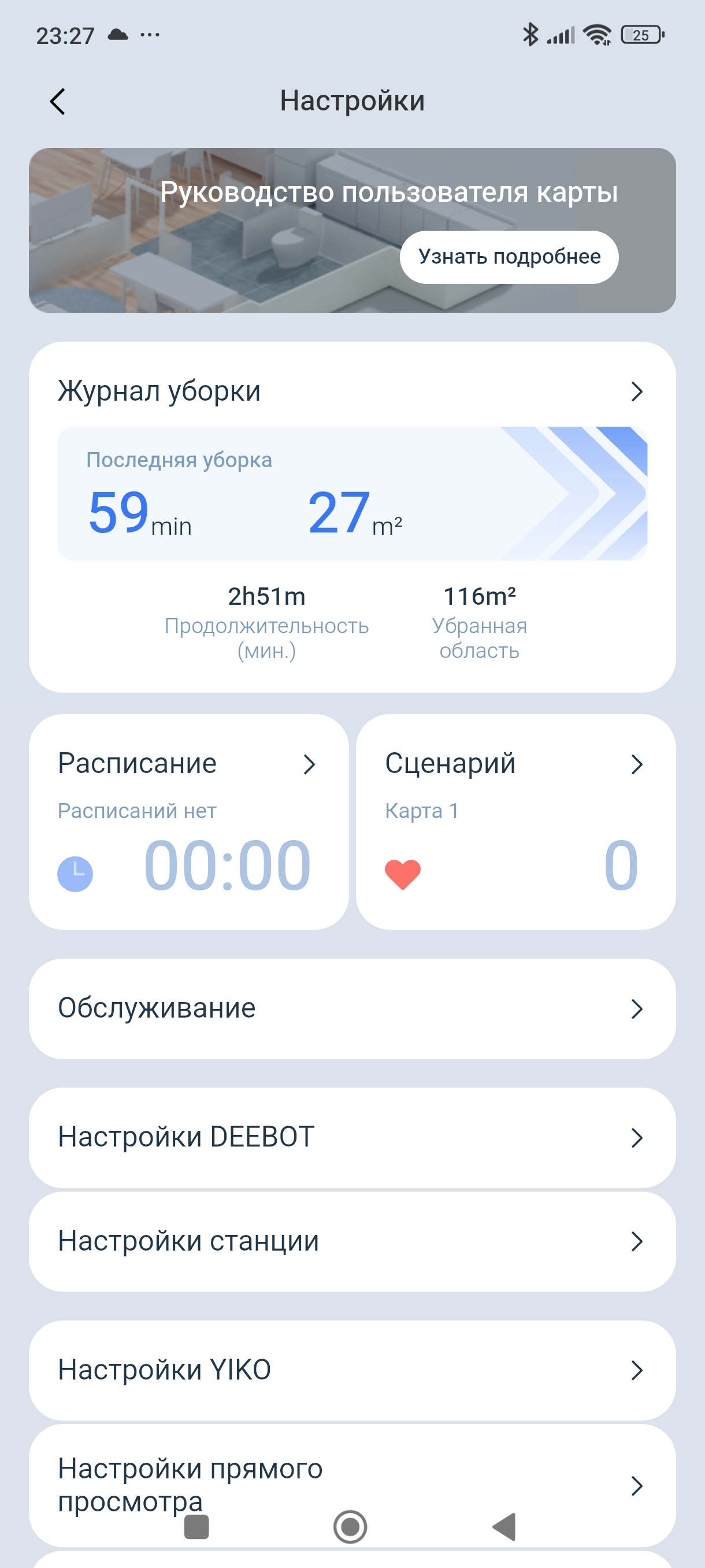 Ну а перейдя в раздел настроек, мы увидим множество всевозможных пунктов меню и настроек, позволяющих гибко настроить буквально каждый нюанс, касающийся уборки, выбора режима работы базы или самого пылесоса и т. д. и т. п.