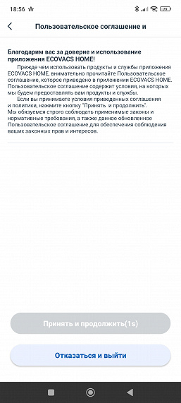 Мобильное приложение Ecovacs Home без каких-либо сложностей загрузилось из Google Play и установилось без проблем. Как водится, в начале нам предстоит завести аккаунт (если его еще нет), принять пользовательское соглашение и ввести название для своего дома.