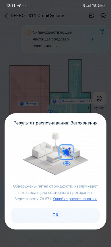 В ходе уборки робот сообщит о распознанных загрязнениях и препятствиях, а по завершении — покажет статистику.