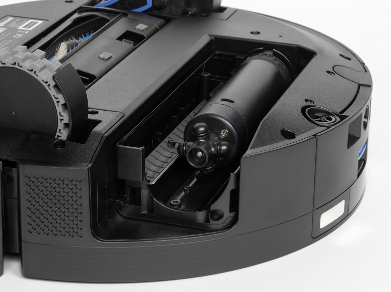 Сначала скажем о традиционных элементах. Спереди по центру мы видим направляющее колесо, заключенное в сферу. По периметру — четыре пары датчиков перепада высоты. Слева от центрального колеса находится ультразвуковой датчик распознавания ковровых покрытий.