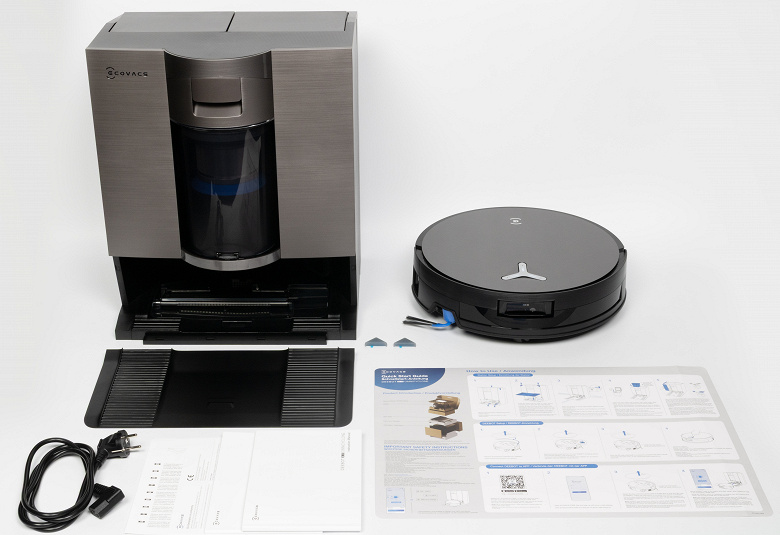Итак, давайте рассмотрим устройство и обратим внимание на все обычные и необычные детали. Начнем, как водится, с самого робота. Однако сначала бросим общий взгляд на само устройство и станцию самоочистки. Выглядит вся конструкция массивно и внушительно. Никакой «легкости», как на фотографии с коробки, тут не наблюдается. Напротив — перед нами предстало визуально тяжеловесное решение, выполненное в темных и серых тонах, без скругленных углов (за исключением контейнера-пылесборника).