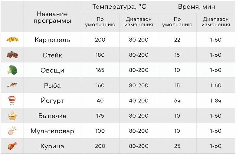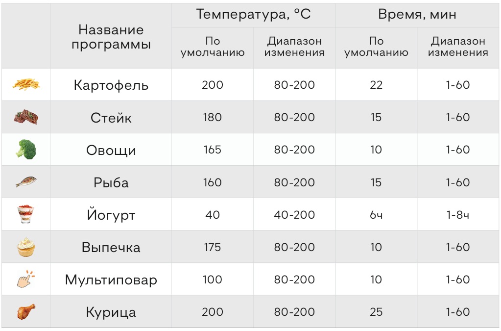 | Регулировка температуры приготовления | от 30 до 200 °C с шагом 5 °C |