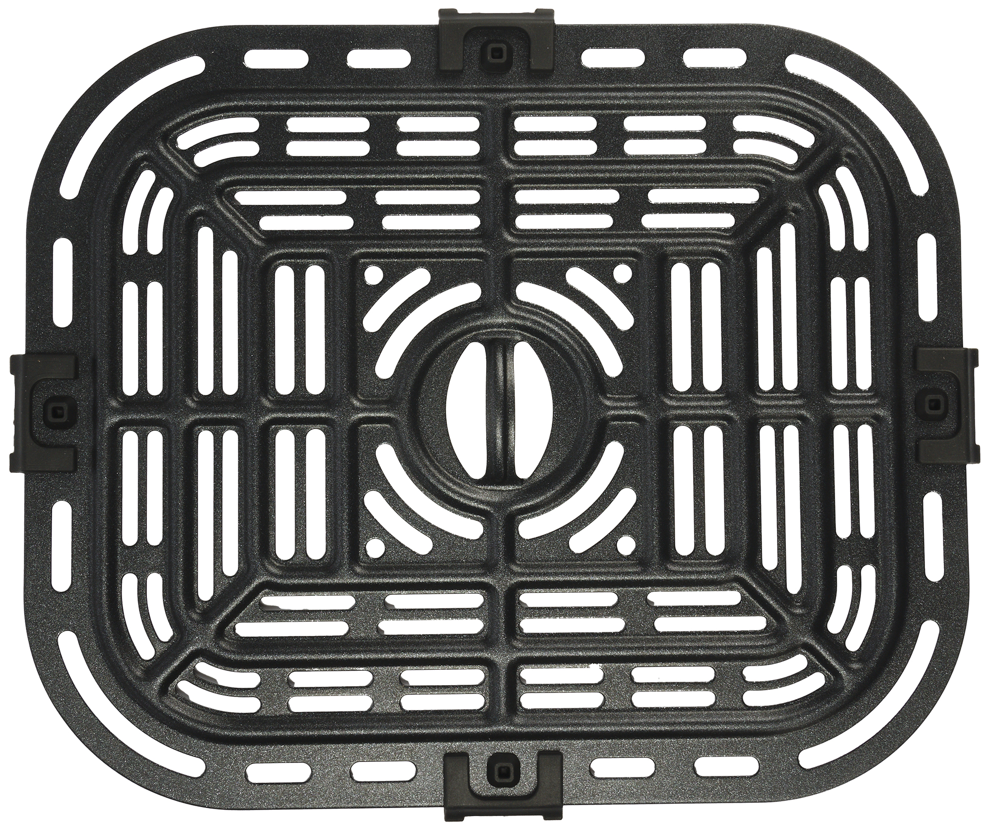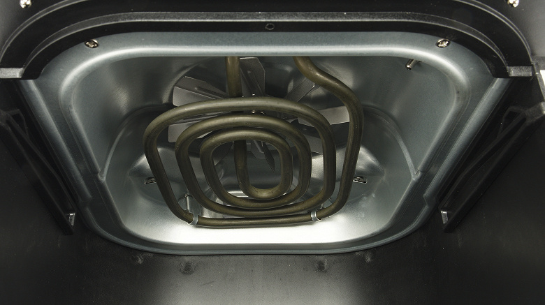 Дно и боковые стенки корпуса внутри изготовлены из металла. Сверху по центру размещен открытый нагревательный элемент. Над ним — вентилятор, который обеспечивает конвекцию во время работы аэрогриля.