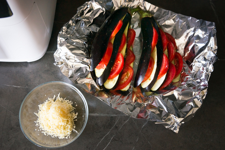 Мы повысили температуру до 200 °C и через 30 минут овощи были готовы. Развернули фольгу, присыпали блюдо тертым сыром и отправили обратно еще минут на 10.