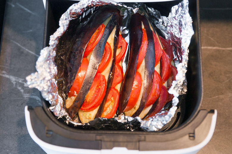 Первые 15 минут аэрогриль работал в режиме Овощи с установленной по умолчанию температурой 165 °C. Работал бы и дальше, но уж очень медленно шло запекание. Для баклажанов такого нагрева все-таки маловато.