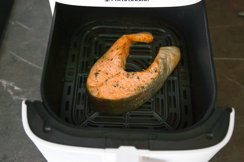 Семгу мы готовили на автоматической программе Рыба с нагревом по умолчанию — 160 °C. Время тоже оставили неизменным — 15 минут.
