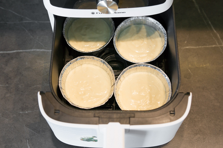 Заданные производителем 175 °C и 10 минут мы посчитали недостаточными, поэтому изменили цифры на 180 °C и 20 минут. Через 10 минут выдвинули чашу и проверили обстановку. Верхушки кексов уже схватились и прилично подрумянились, но внутри, естественно, всё еще было сырое.