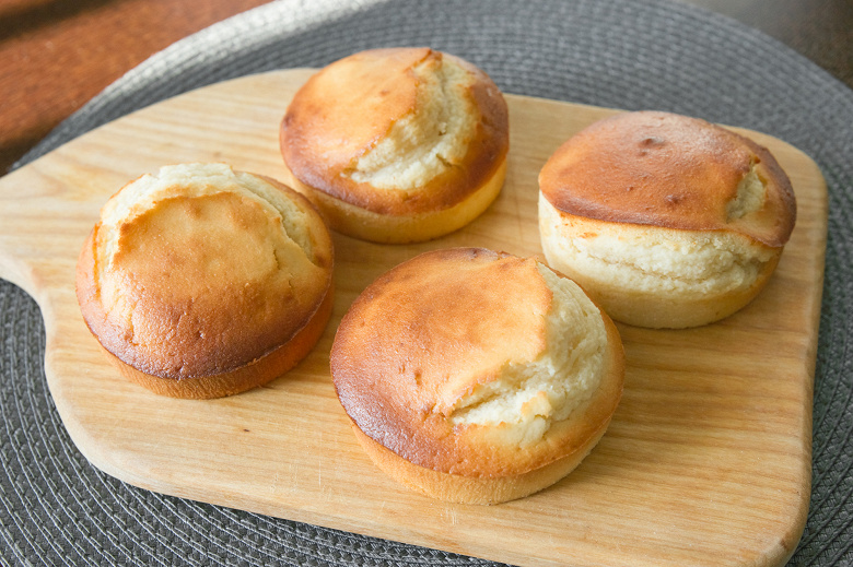 Ингредиенты: мука — 130 г, разрыхлитель — 1 ч. л., сахар — 70 г, соль — щепотка, 2 крупных яйца, сливочное масло — 70 г, молоко — 110 мл, сок лимона — 2 ст. л.