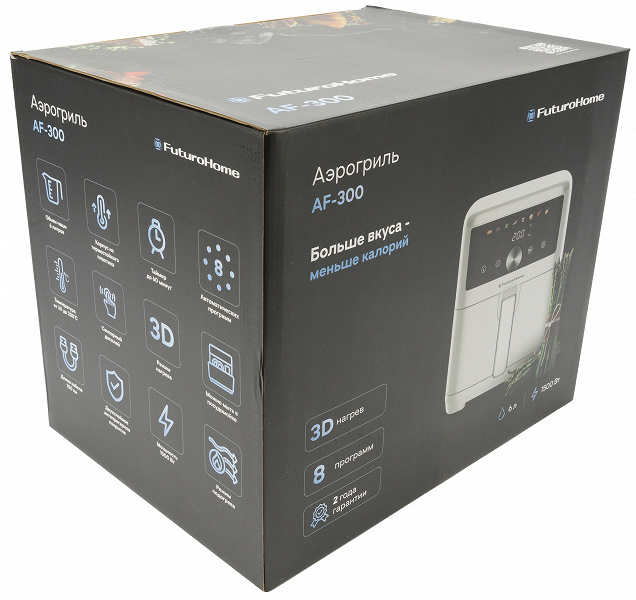 FuturoHome MTR AF-300 оснащен вместительной 6-литровой чашей, имеет широкий диапазон нагрева, набор полезных режимов и гибкую настройку параметров. Как заявляет производитель, с помощью этого аэрогриля можно не только запекать и быстро разогревать продукты, но и готовить йогурт. Проверим, рассмотрим прибор максимально подробно и расскажем о том, как прошло тестирование.