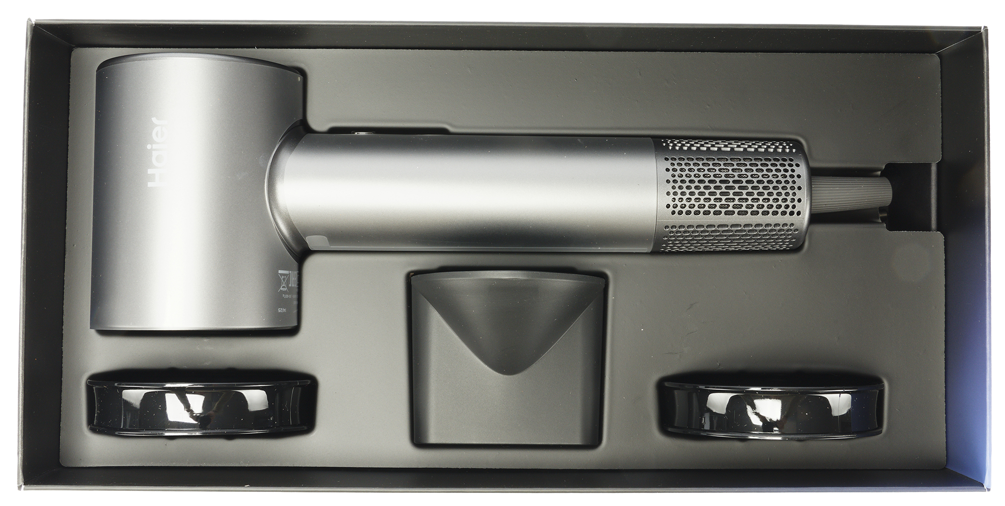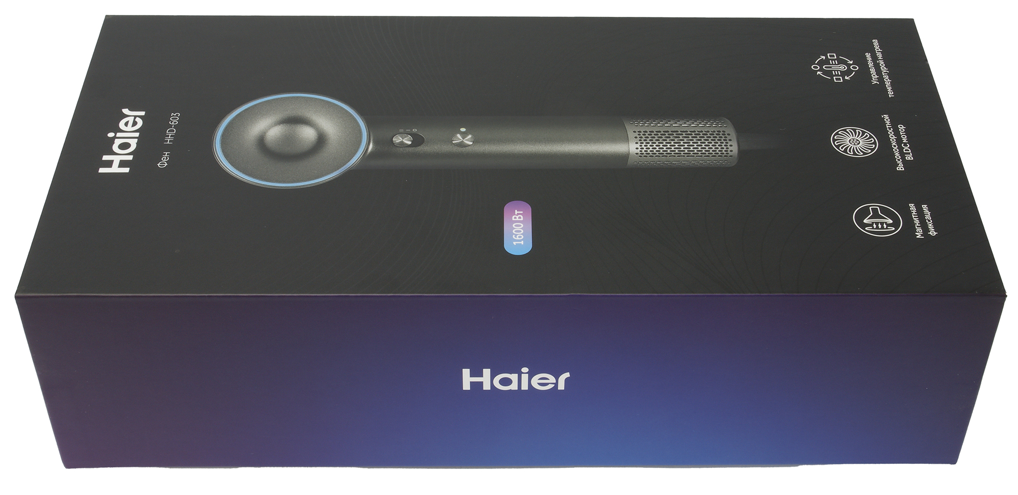 Haier HHD-603 поставляется в симпатичной небольшой коробке из прочного толстого картона с качественной цветной полиграфией. На лицевой стороне размещена фотография фена, рядом с ней — логотип бренда, уровень мощности и пиктограммы с обозначением главных особенностей модели. С обратной стороны — краткая техническая информация и данные о производителе.