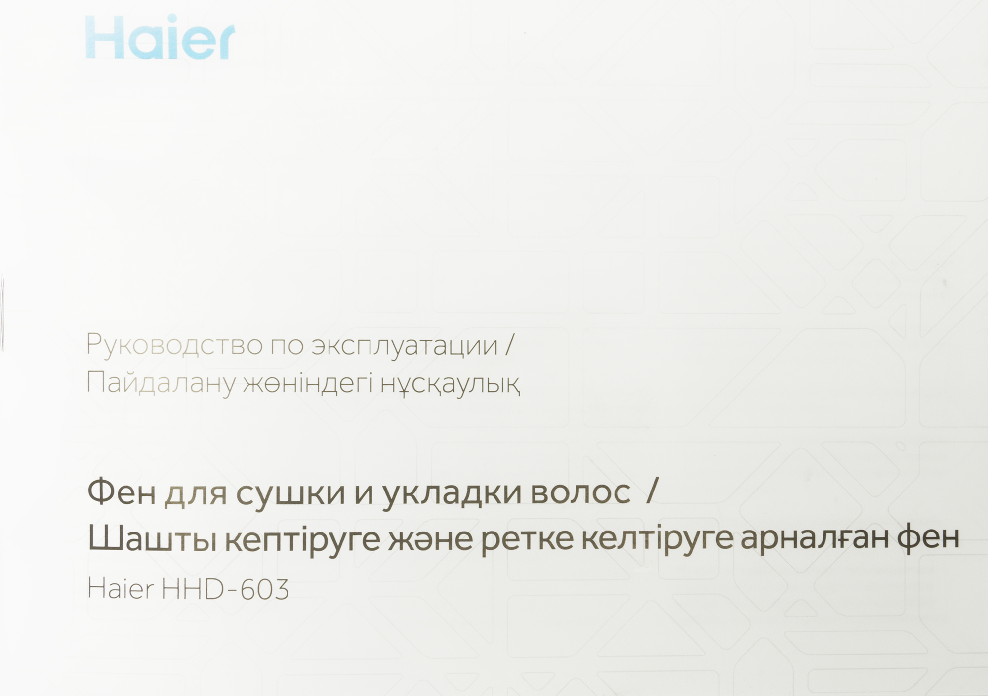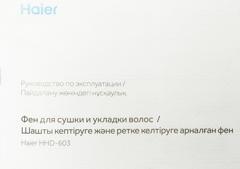Руководство пользователя на русском и казахском языках представлено в виде миниатюрной 17-страничной брошюры. В документе есть подробное описание конструкции фена, нюансов управления, правил ухода и информация о гарантийных обязательствах производителя.