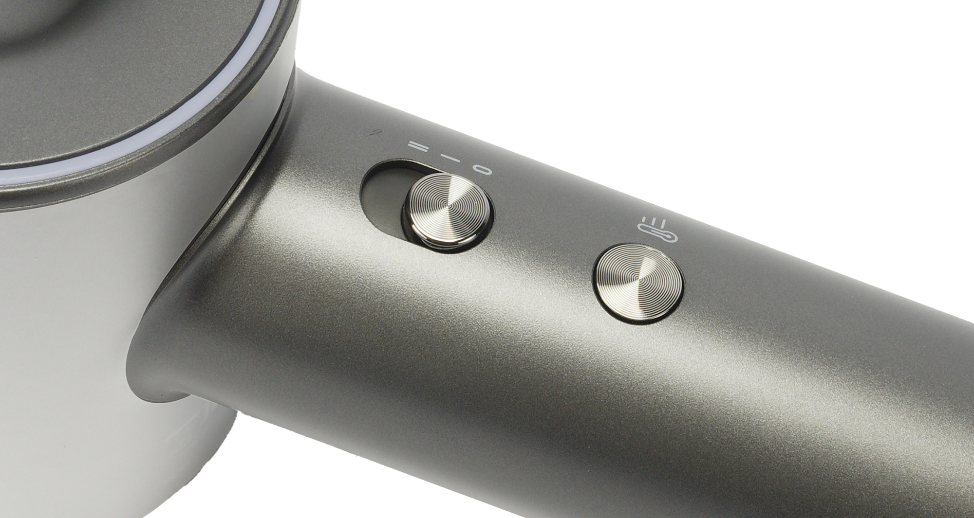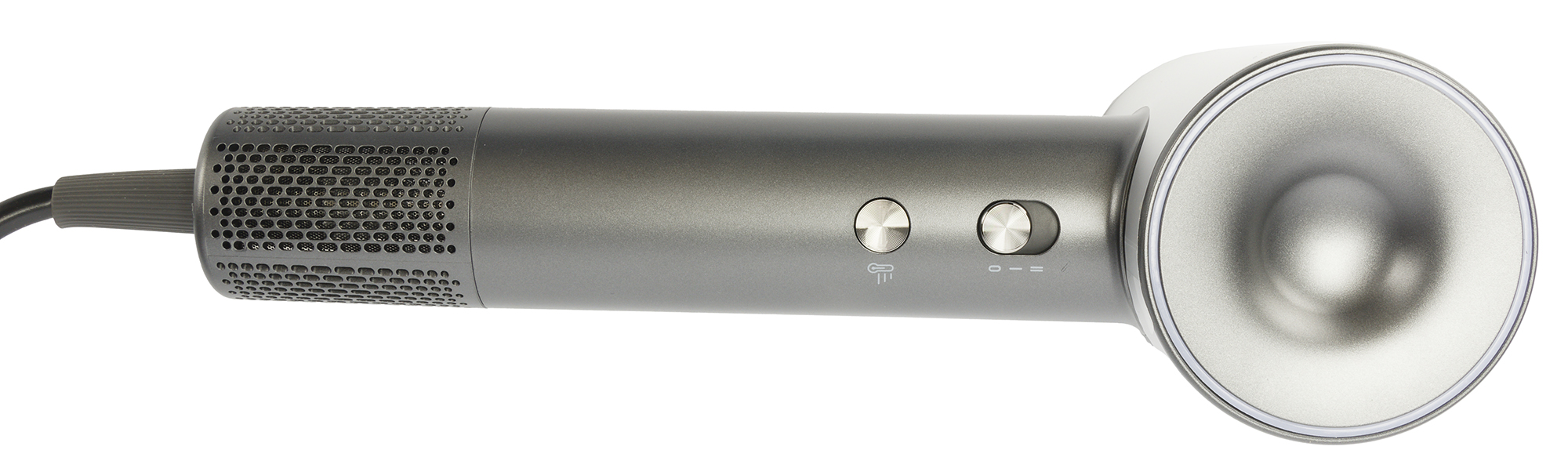 Корпус фена выполнен из пластика. Покрытие строгого графитового цвета матовое и абсолютно не маркое. Из украшений только логотип, нанесенный серой краской на цилиндрический корпус с обеих сторон. Ощущений, что надпись легко поцарапать или краска быстро сотрется при частой эксплуатации — нет.