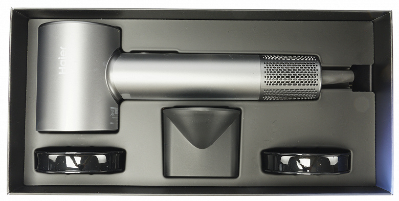 Комплект состоит из: самого фена, концентратора, пары магнитных креплений на стену, четырех самоклеящихся стикеров и инструкции.