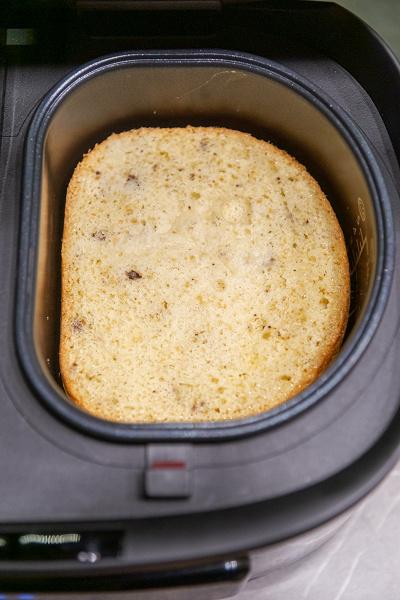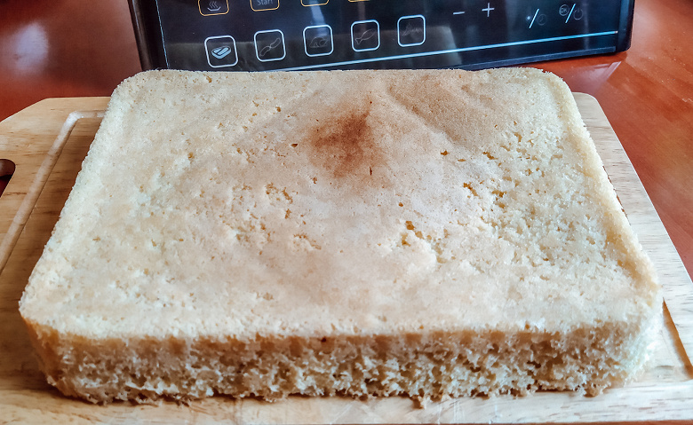 Через 50 минут появился роскошный бисквит высотой 5,5 см. За это время он отлично пропекся и не подгорел. Мы оставили его в чаше с открытой крышкой еще на 15 минут. Потом накрыли чашу контейнером для варки на пару́, перевернули, и таким образом целый и невредимый он продолжил остывать, не намокая снизу, прямо на контейнере.