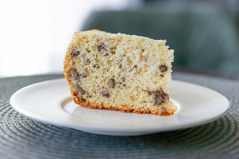Прекрасные бисквиты-шарлотки нам удалось приготовить в мультиварках Garlyn MPC-10 и Garlyn MR-Pro 20, а бисквит без яблок — в мультиварке с двумя чашами Garlyn MR-Duo 10. Правда, из-за небольшого объема чаши (2,4 л) бисквит в ней вышел небольшим, его можно было есть как самостоятельное пирожное или приготовить из него маленький тортик. Но качество самого коржа оказалось отменным, несмотря на то что мы утяжелили тесто грецкими орехами и замоченным изюмом.
