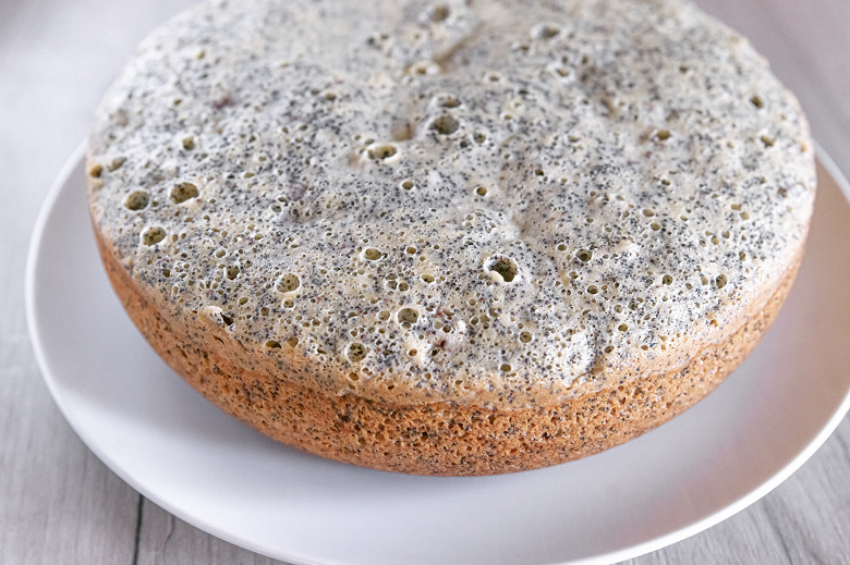 Максимально удачный бисквит — да не простой, а маковый — получился у нас в мультикухне Redmond RMK-M451E — мультиварке с поднимающимся тэном и сковородой. Но бисквит мы выпекали в чаше в программе Bake / Выпечка в течение 50 минут. Рецепт этого бисквита можно посмотреть в обзоре мультикухни, а здесь процитируем автора теста, потому что он дает лайфхак, как вытащить бисквит, чтобы тот не осел: