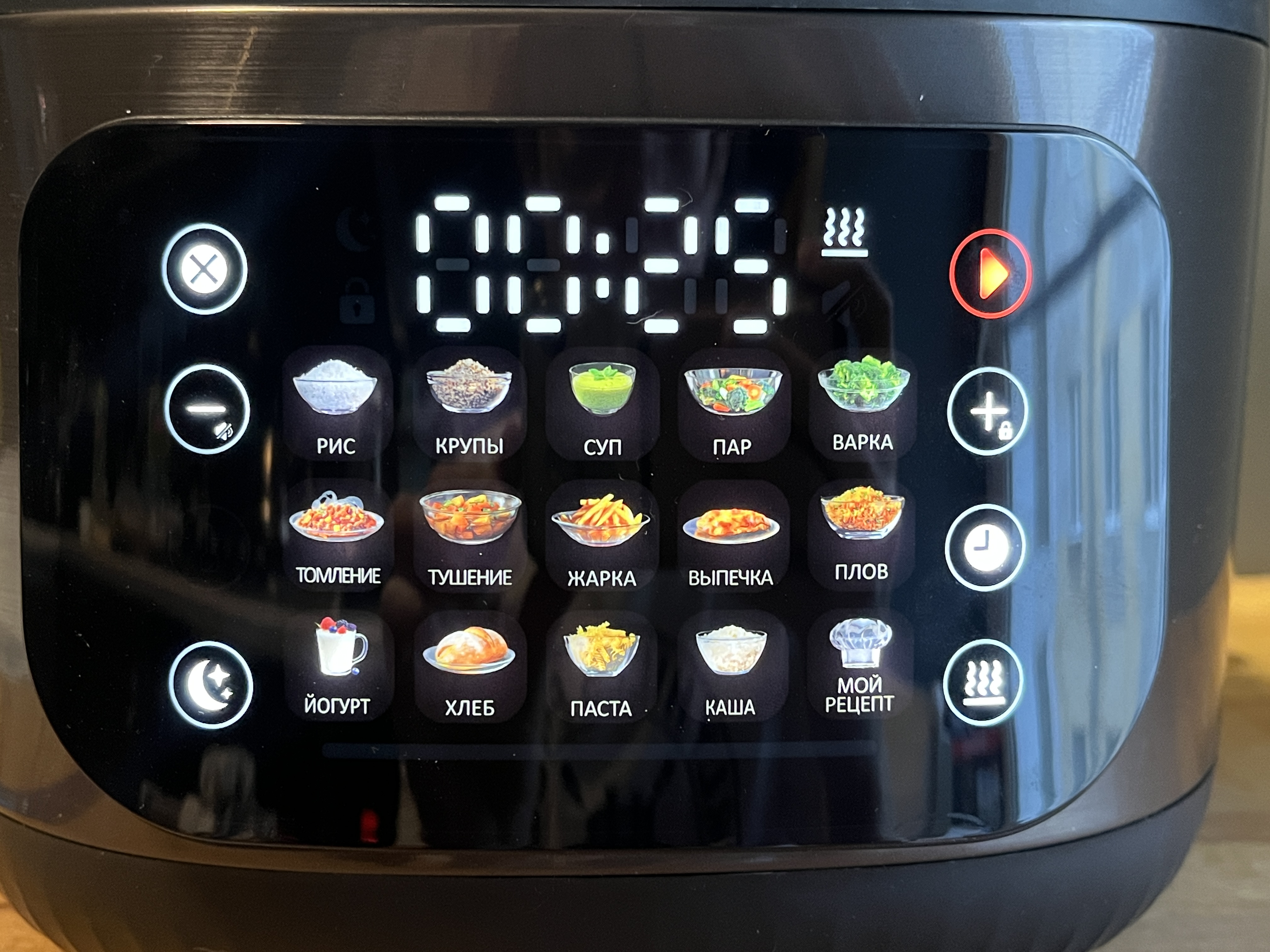 Дисплей яркий, кнопки нажимаются легко, срабатывают уверенно. Сенсорное управление отзывчивое, меню логичное, а технология Color Cook на цветном дисплее действительно помогает ориентироваться в этапах приготовления, особенно в первое время. Не нужно каждый раз заглядывать в инструкцию — прибор буквально подсказывает, что происходит.