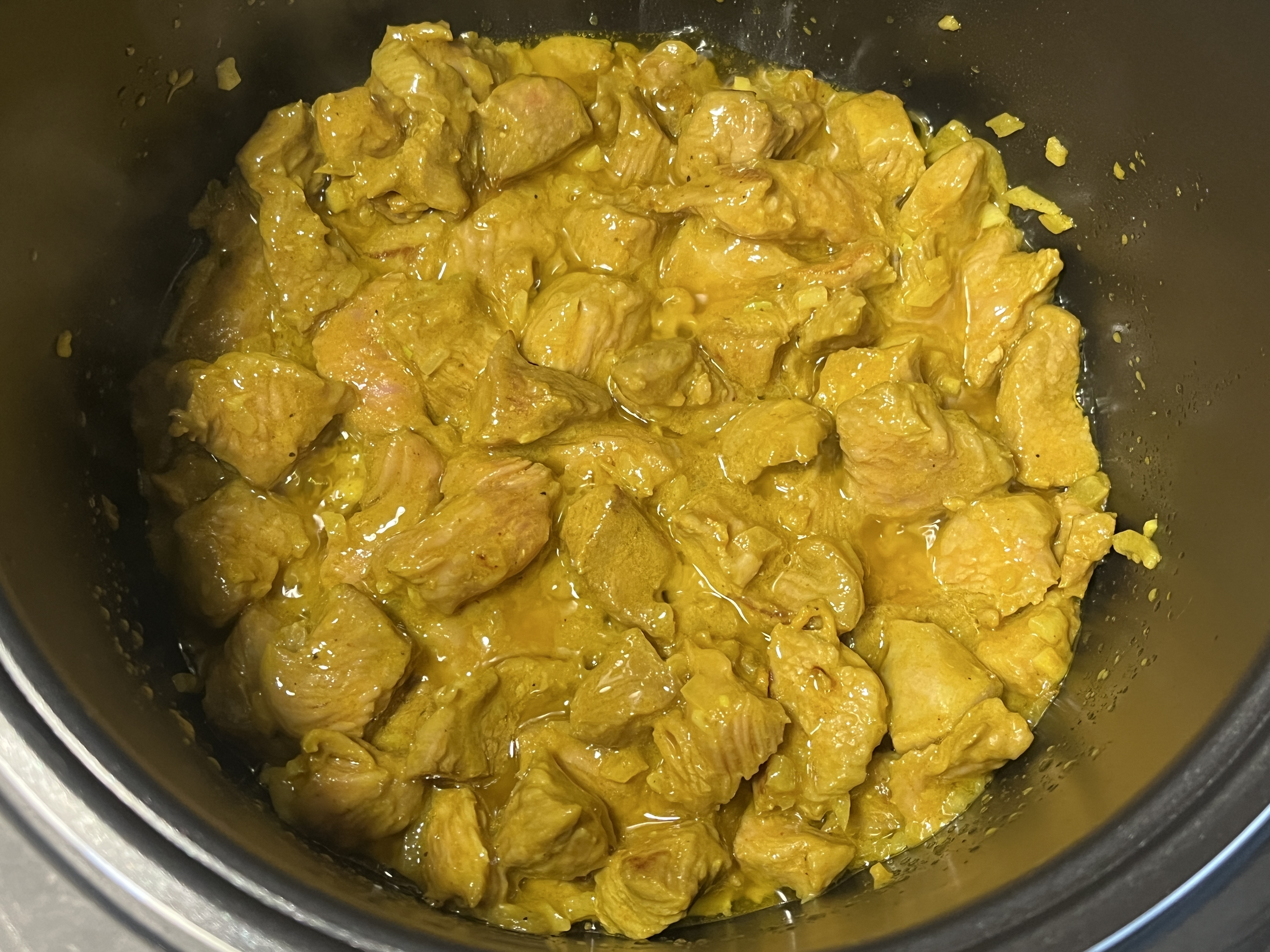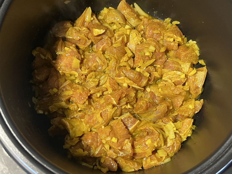 Для начала подготовили филе бедра индейки: нарезали его на небольшие кусочки, добавили карри, подсолнечное масло, мелко нарезанный лук и чеснок. После чего отправили мариноваться на всю ночь, чтобы при тушении мясо получилось мягким, а не резиновым.