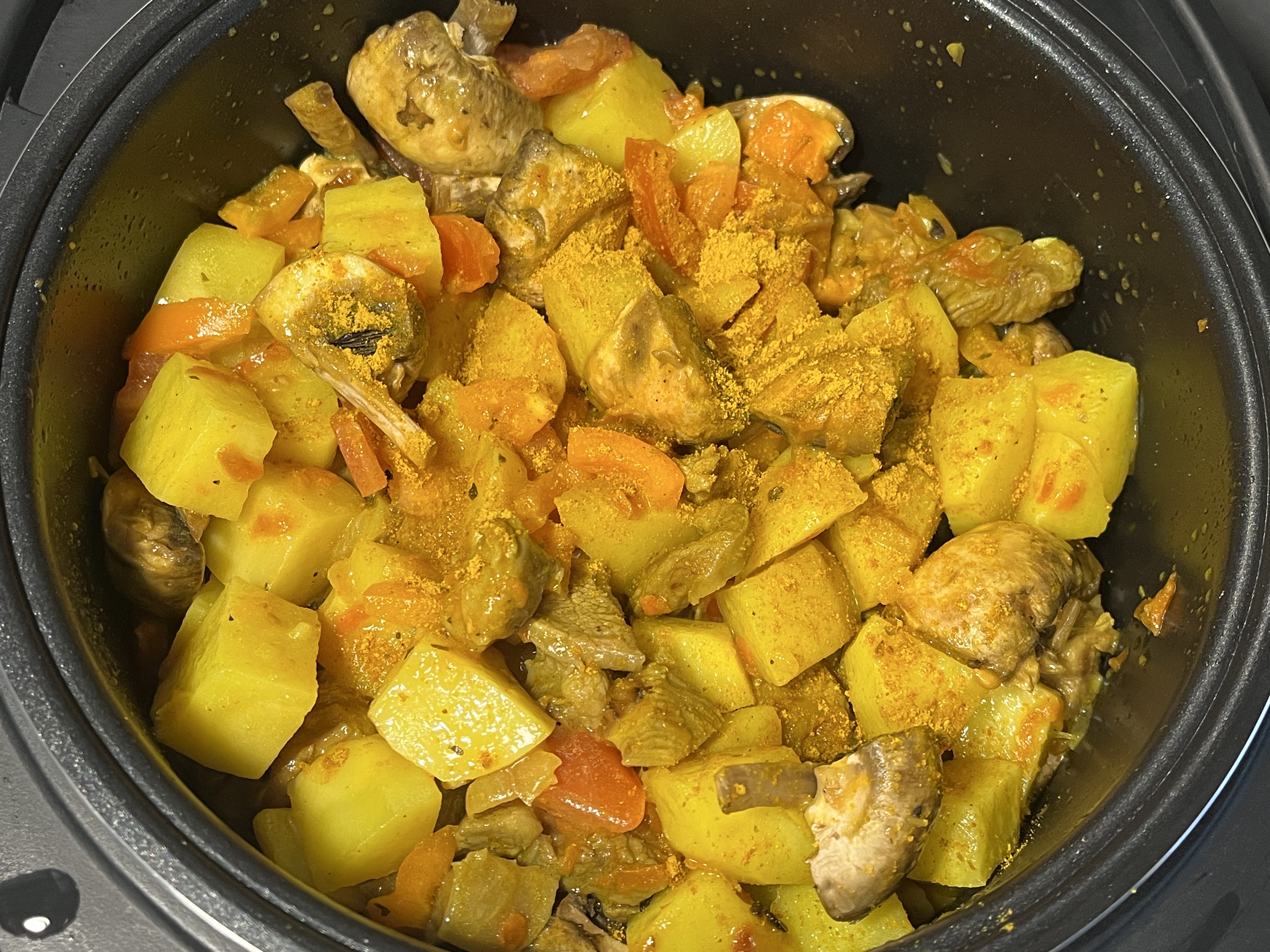 Добавили еще немного карри, паприки, черного молотого перца, сушенного укропа, красного острого перца, тимьяна, майорана, кинзы, чабера и соли. Хорошенько всё перемешали и оставили мультиварку в покое.