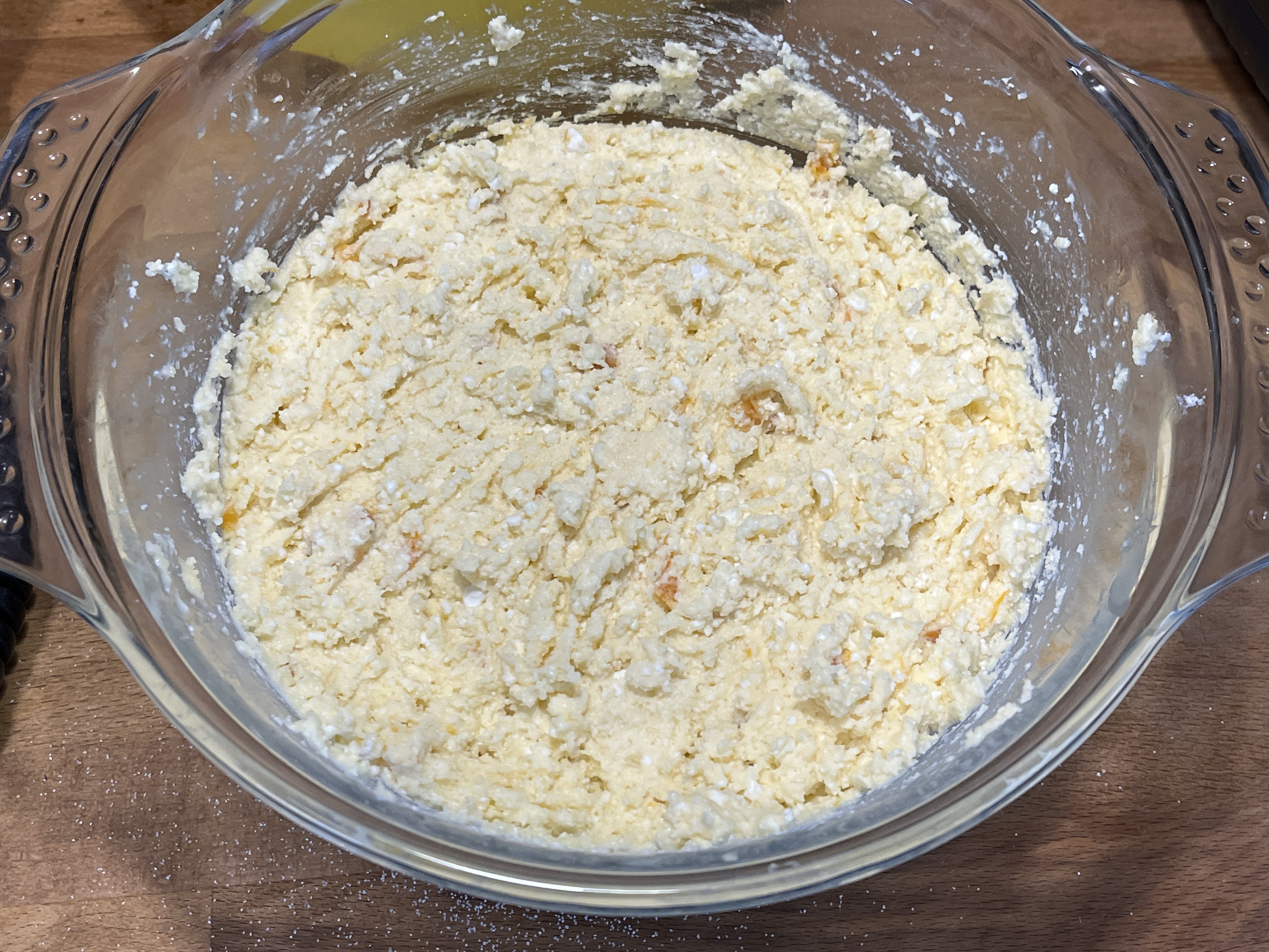 К творогу и творожной массе добавили щепотку соли, манку, разрыхлитель. Разбили до мелких комочков, добавили желтки, сметану, ванильный сахар и тщательно всё перемешали. Оставили полученную массу на 20 минут, чтобы манка набухла.