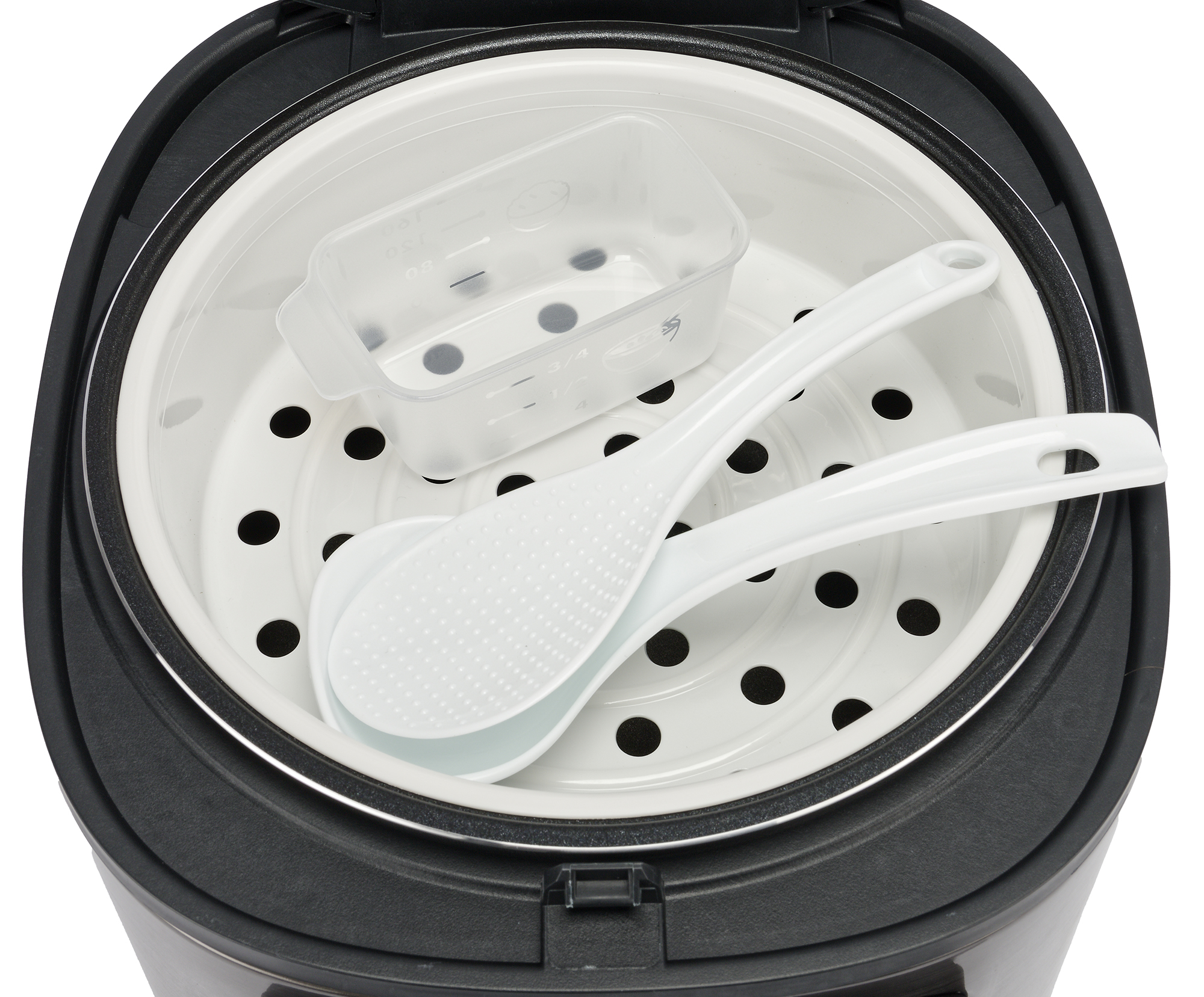 В комплекте имеется белый пластиковый контейнер для приготовления на пару́ с отверстиями по всей площади. А также пластиковые ложка, черпак и мерный стаканчик с градуировкой: риски соответствующие 40, 80, 120, 160 мл и ¼, ½ и ¾ объема стакана.