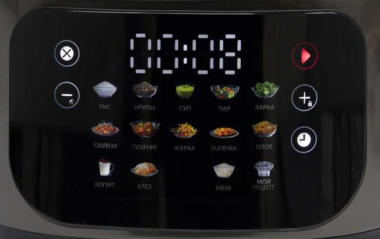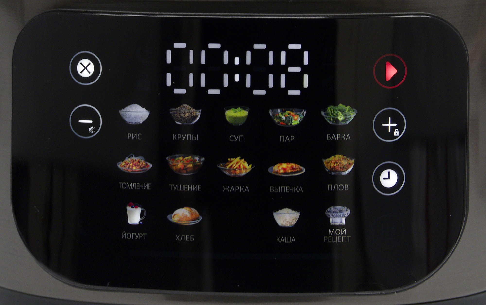 Теперь перечислим кнопки выбора автоматических программ: рис, крупы, суп, на пару́, кипячение/варка, тушение, томление, жарка, выпечка, плов, йогурт, хлеб, паста, молочная каша.