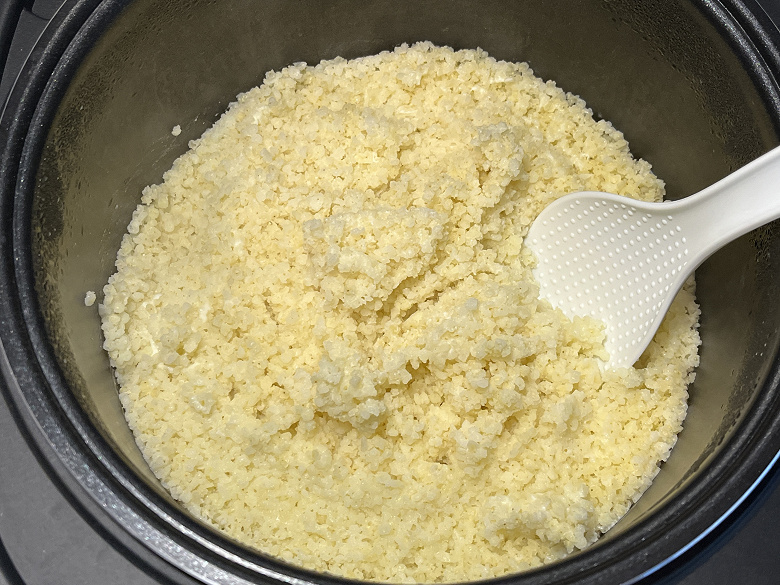 Она получилась чуть более разваренной, чем нам хотелось, но это произошло именно по причине того, что каша простояла некоторое время на автоподогреве и на нее стекал конденсат с крышки.