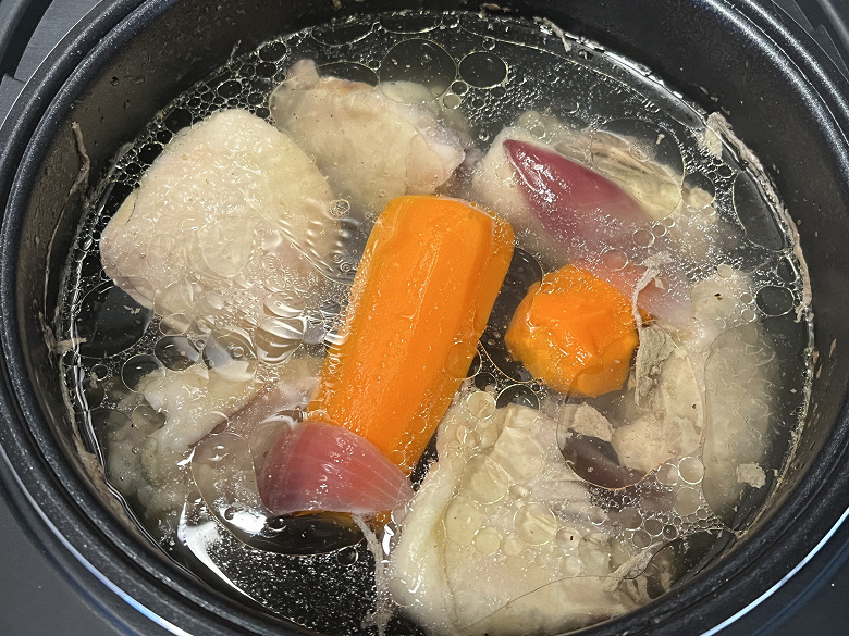 Мы подготовили несколько крупных куриных бедер, морковь, красный лук, душистый перец и отправили их вариться в течение часа в режиме «Суп».