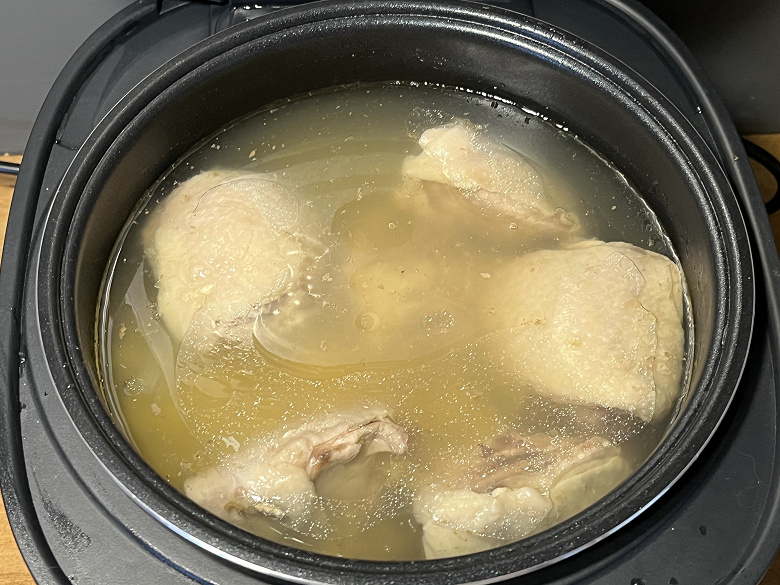 Чтобы проверить, насколько тщательно прибор контролирует процесс закипания, мы решили приготовить куриный суп. Одна из основных ценностей хорошей мультиварки — отсутствие длительного кипения при варке бульона (и к тому же необходимости следить за процессом), благодаря чему пена не образуется и он получается прозрачным.